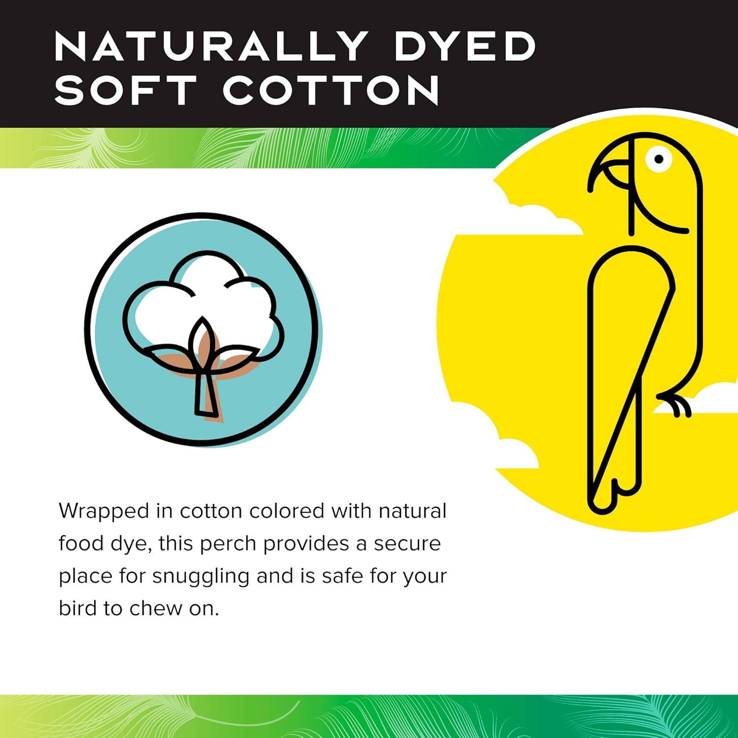 - NATURALLY DYED, SOFT COTTON: Wrapped in cotton and colored with natural food dye, these act as perches, rings, and small bird toys; Our soft cotton ring provides a secure place for snuggling and is safe for your bird to chew on