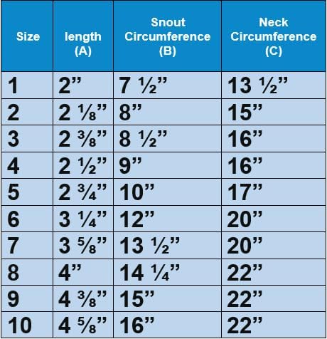 - PLEASE MEASURE BEFORE BUYING: Please refer to the product description or image section for an in-depth chart on how to size your dog. Measure from the tip of the nose to the slope below their eyes for snout length (Length A in Chart). Snout Circumference should be measured around the widest part of the snout with the dog’s mouth closed, just below the eyes (Snout B in Chart). The Neck circumference is measured around the neck right behind the ears (Neck C in Chart). If the circumference measurement fits one of the sizes in the chart, but the length of the snout is over the maximum range for that size, you should choose the next size for a better fit.