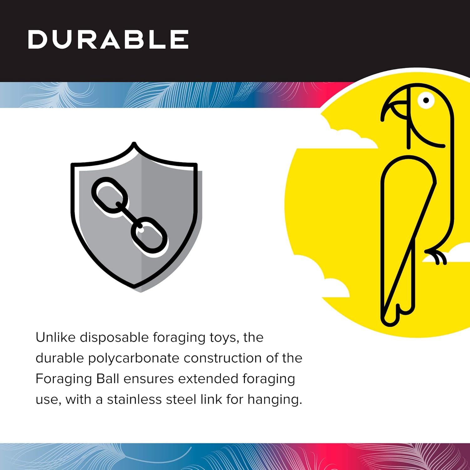 - DURABLE: Unlike disposable foraging bird toys, the durable polycarbonate construction of the Foraging Ball ensures extended foraging use, with a stainless steel link for hanging