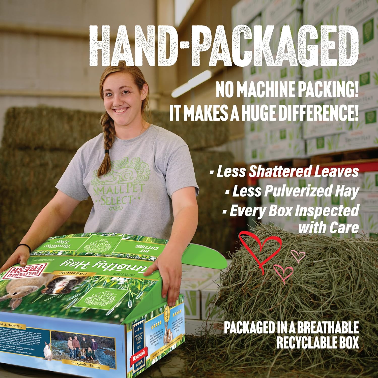 - Hand-Selected Timothy Hay - We hand-pack each box in small batches to ensure only the highest quality 100% US-grown 1st cut Timothy hay arrives at your door. 1st cut Timothy hay features a higher fiber content and more flower heads than any other cutting. It includes a higher stem content to wear down overgrown teeth and provides a boost in fiber for happy digestive systems, though it is still very soft and leafy.