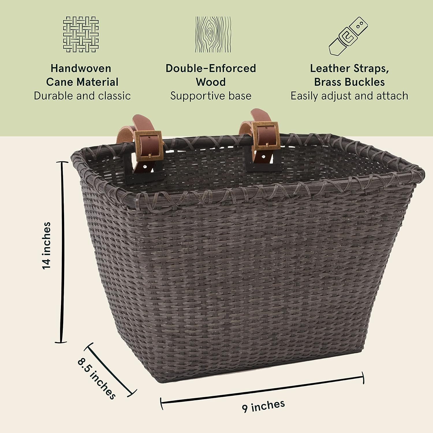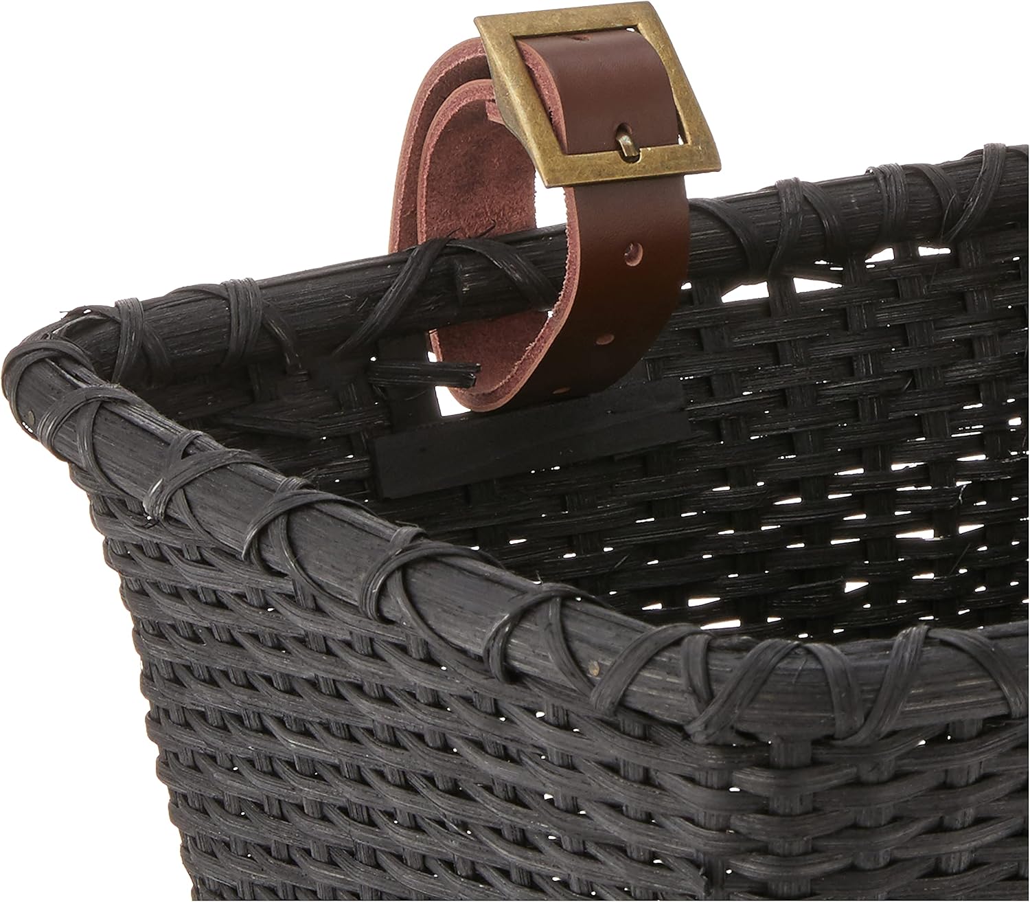 - Adjustable authentic leather straps with brass buckles attach basket to front handlebars without tools