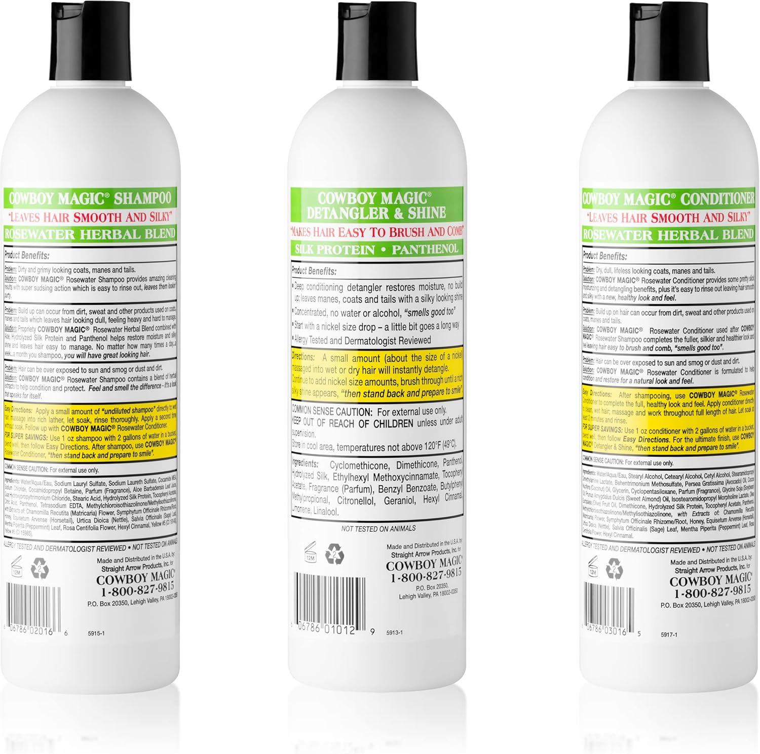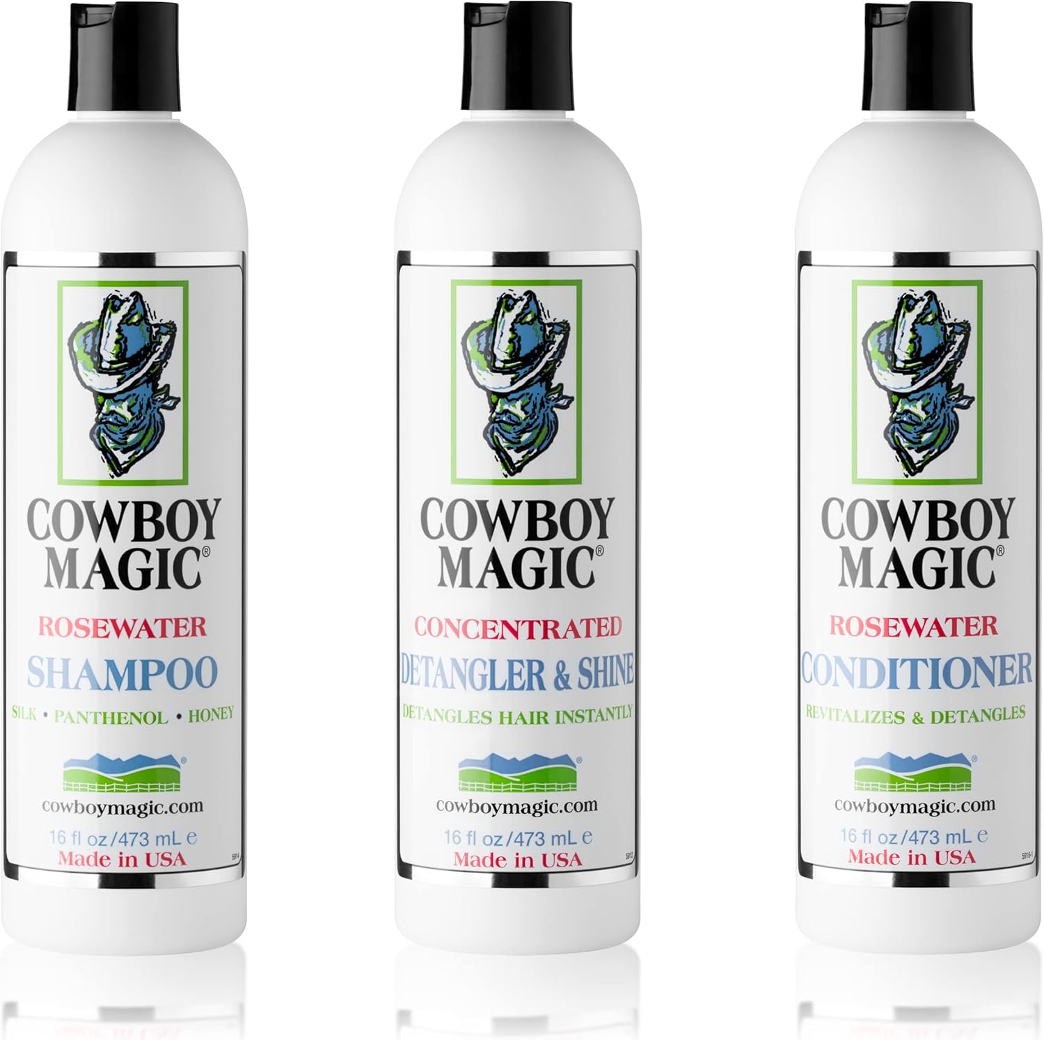 Cowboy Magic Shampoo + Conditioner + Detangler & Shine 16 Ounce each With Silk Panthenol and Honey Great For Horse, Humans, And Dogs Too Silky Coats And Hair