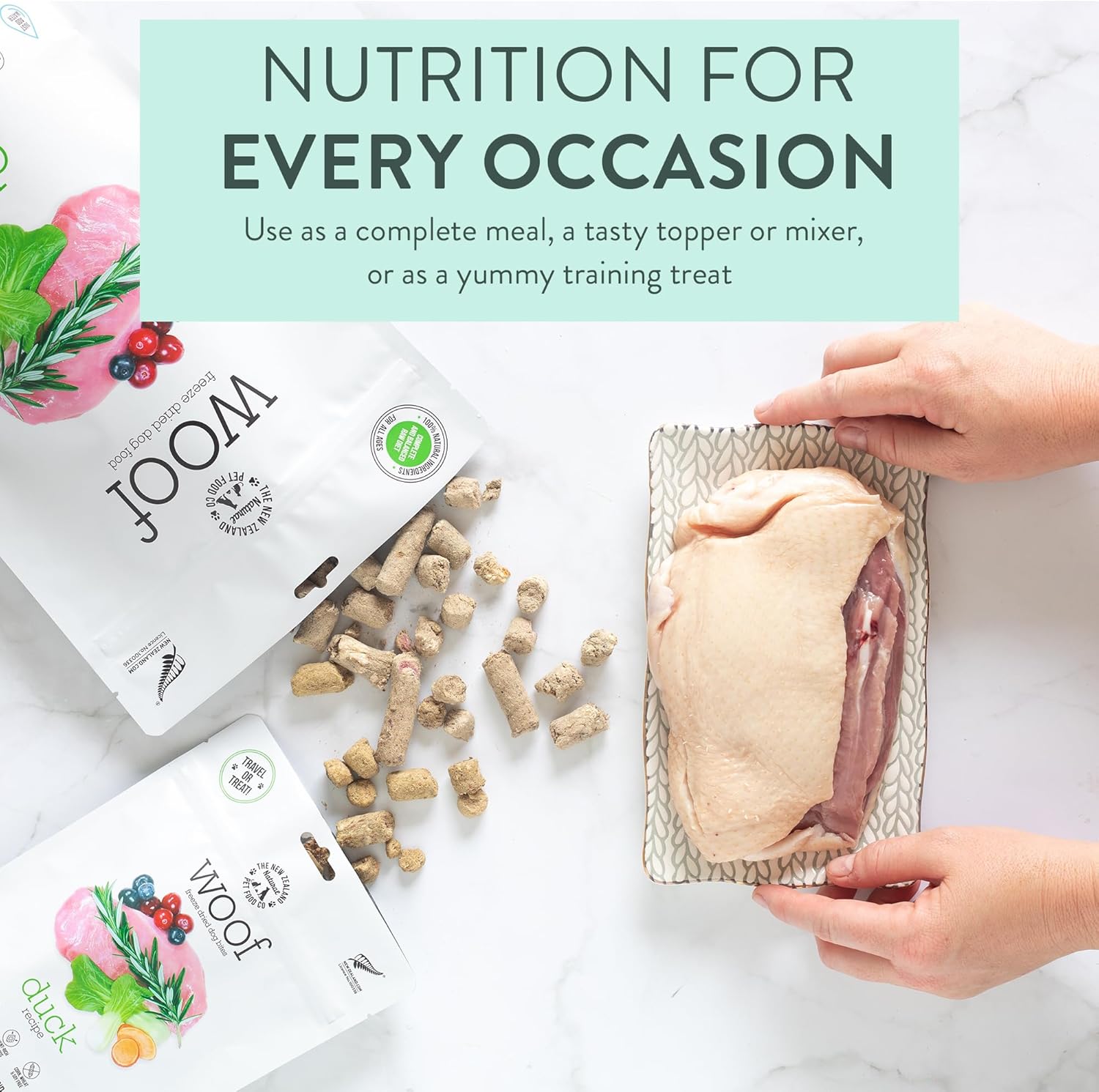 - Ethical & Sustainable - Made in small batches in New Zealand using premium duck with ground bones & combined with New Zealand green mussels, honey, & hoki oil.
