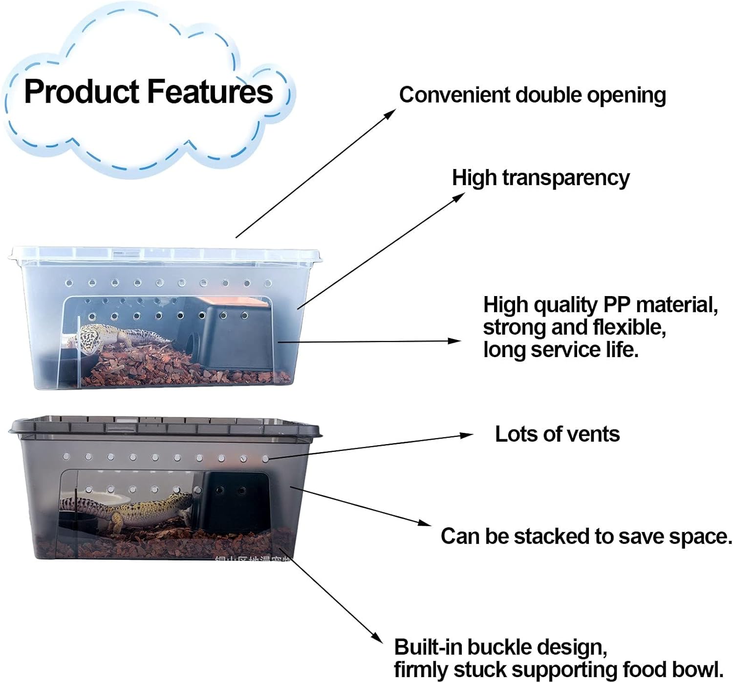 - Suitable pets : The reptile feeding hatching container size is 12.6" x 8.7" x 5.9" (L*W*H). Suitable for snakes, tarantulas, scorpions, geckos, crickets, snails, hermit crabs, frogs, lizards, baby tortoise and other reptile animals