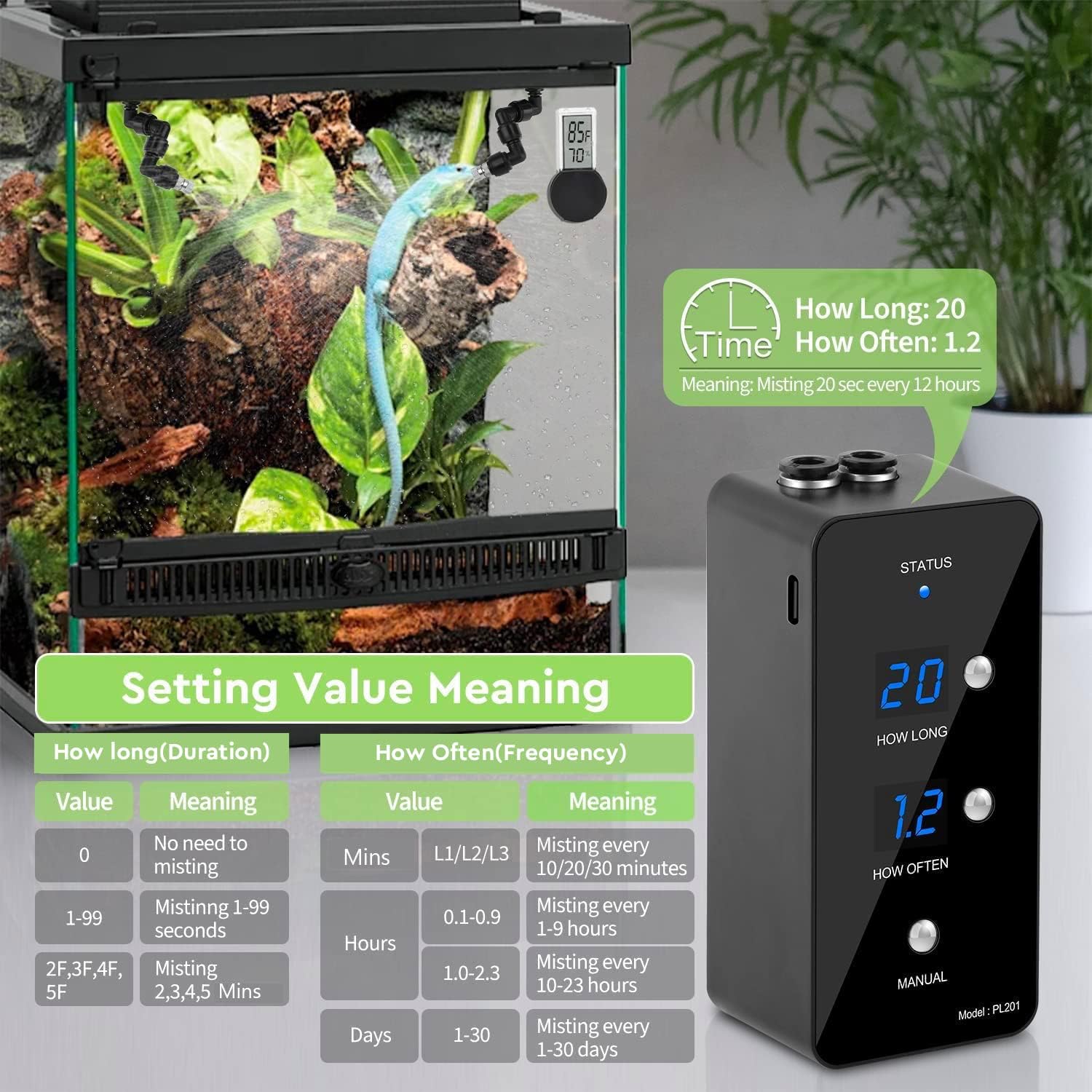 - Timer Function: Only 3 buttons to set up, and you can set a timer of up to 5 minutes spraying time, and 1H to 30-Day misting frequency. No worry about your pets when you are going out for days.