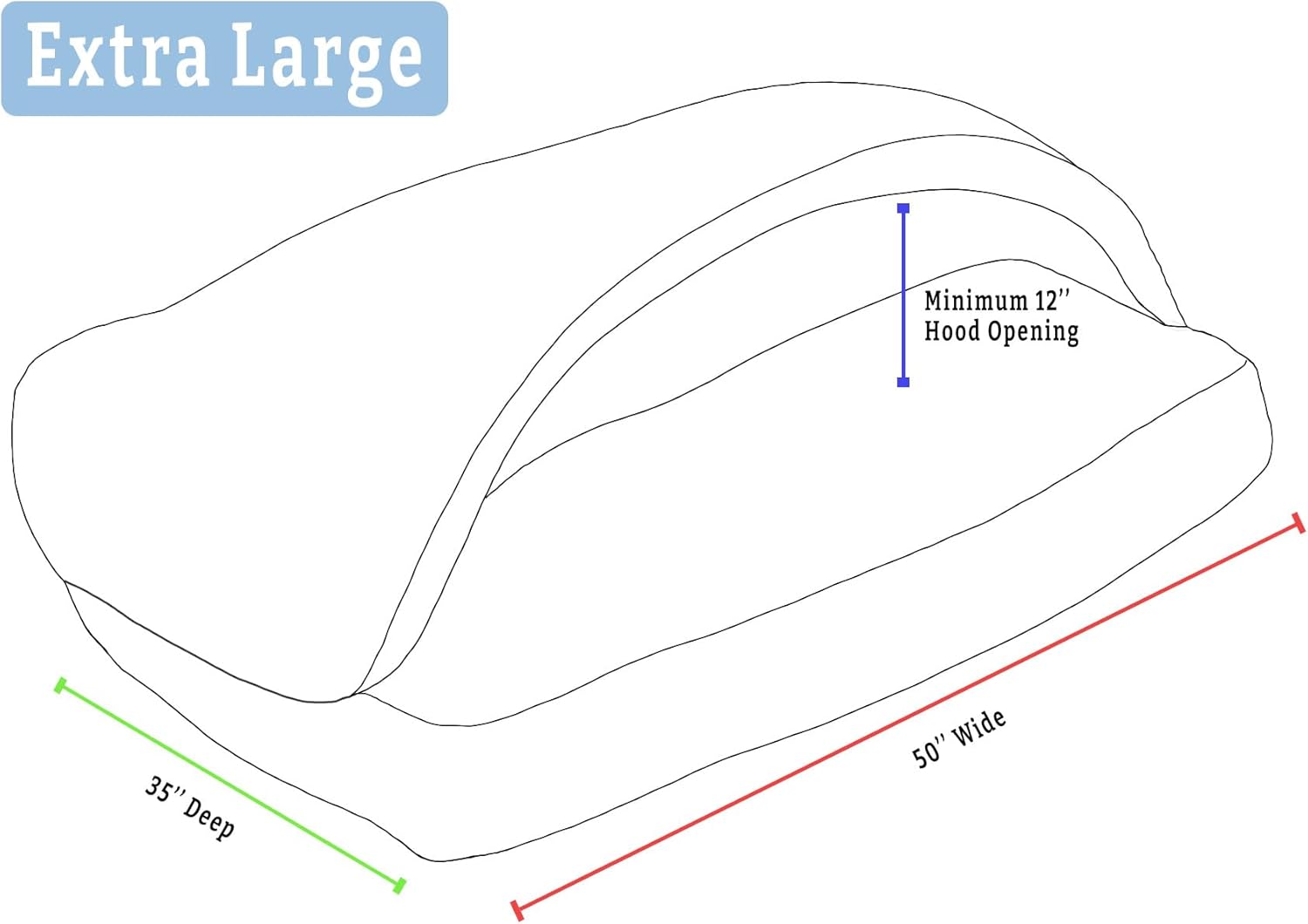 • SIZING: This Extra-Large Rectangle Cozy Cave measures 35” x 50” and has an approximate hood opening height of at least 12”. A thin removable plastic tube keeps the hood open for easy entry or exit and can be removed through the small hole at the corner of the hood for a looser, blanket-like structure. This size Extra-Large creates a snug enveloping feel with enough space for larger breeds or two smaller dogs who prefer to snuggle.