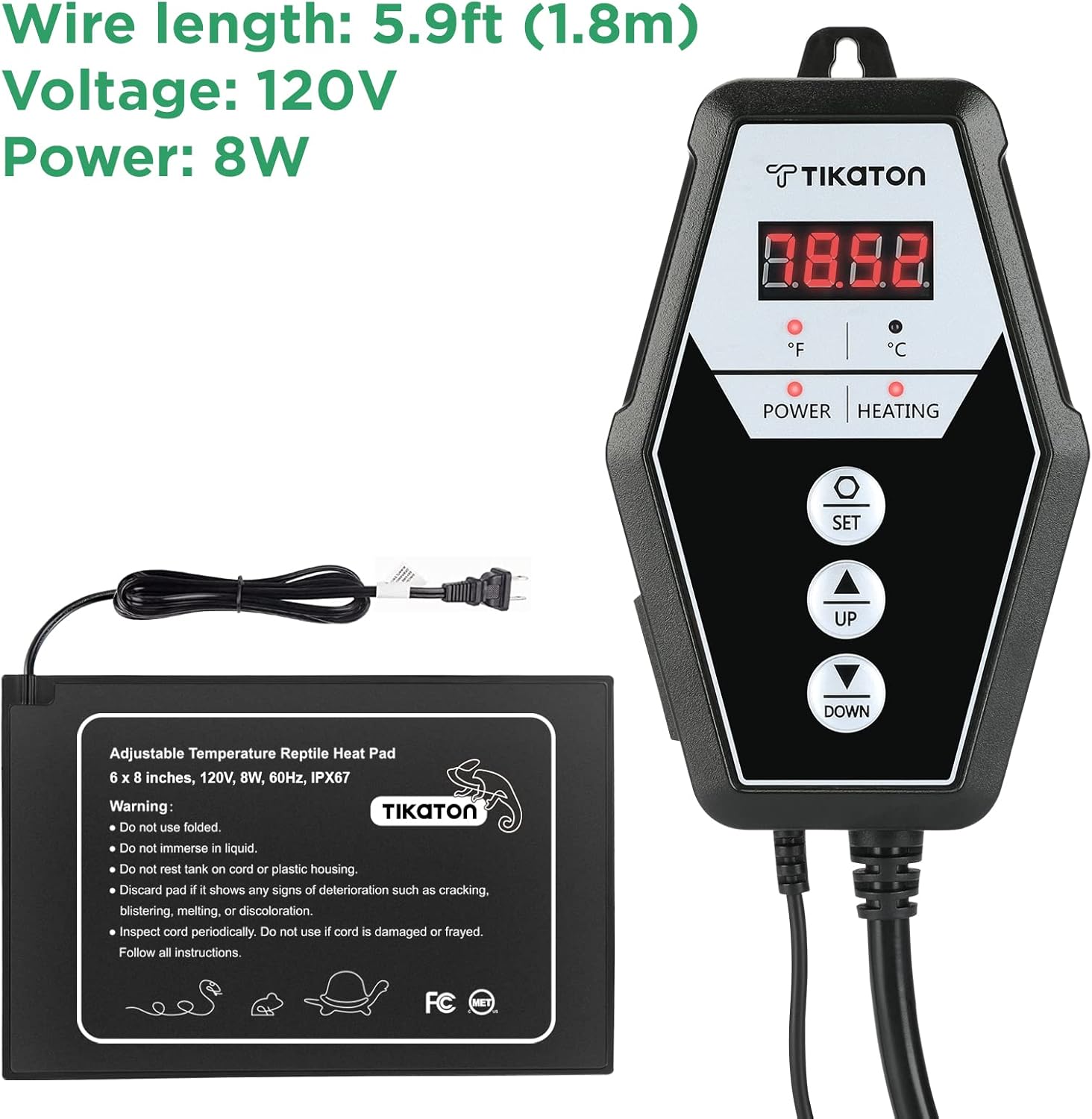 - INTELLIGENT CONSTANT TEMPERATURE: Tikaton reptile heat pad is 120VAC/60Hz,UL-approved; It can get well about 104℉(40℃); Use Tikaton Digital Thermostat to monitor the temperature of your terrarium; Regulates and maintains your preferred temperature within a control range of 40–108 ºF( Temperature display range is 32 -210°F)