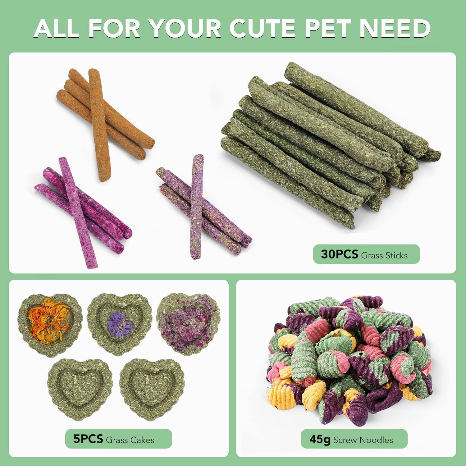 - 【SUPER VALUE PACK】 our rabbit treats set includes rose grass stick ×4, calendula grass stick ×4, myosotis grass stick ×4, timothy hay sticks ×18, timothy grass cake ×2, calendula grass cake ×1, rose grass cake×1, myosotis grass cake ×1, screw noodle snack ×45g.