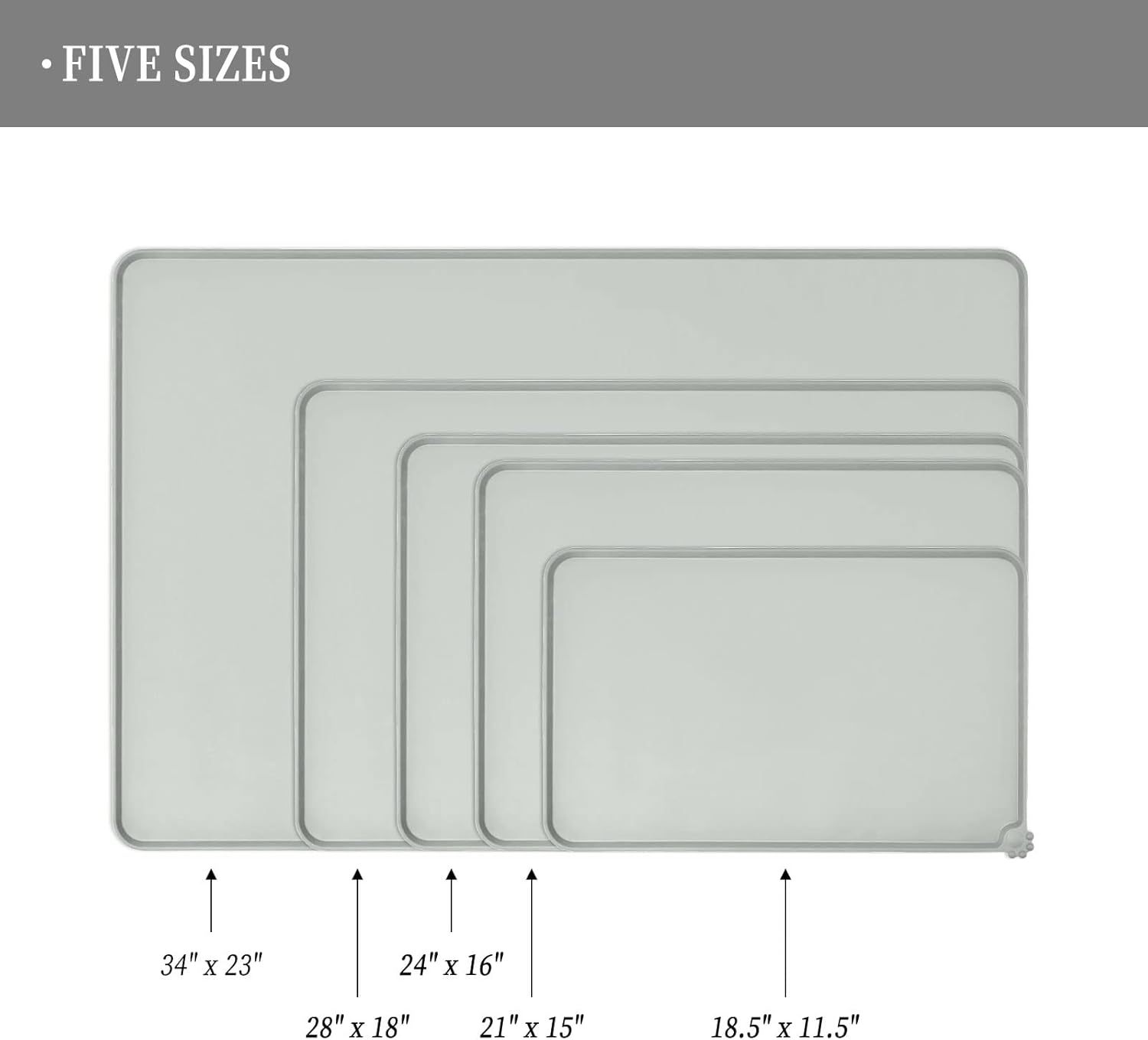 - Various sizes available: our pet mats come in 5 different sizes - 18.5" x 11.5", 22" x 14", 24" x 16", 28" x 18", and 32" x 24". Suitable for all kinds of pets, from puppies to large pets, choose the perfect size for your furry friends and avoid messy spills at mealtime