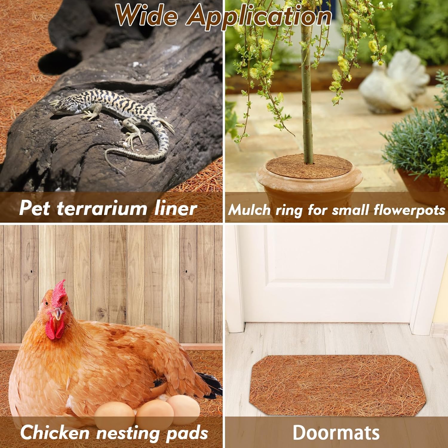 - 🌴【Wide Application】: Reptile terrarium liners can be used for many kinds of reptiles, like turtles, snakes, lizards, chameleon, bearded dragon, Iguana, insects etc. As to the coco mat is square, so you can cut it into round coco mulch disc rings for protect or decorate small flowerpots. It is also a good choice for chicken nesting box liners
