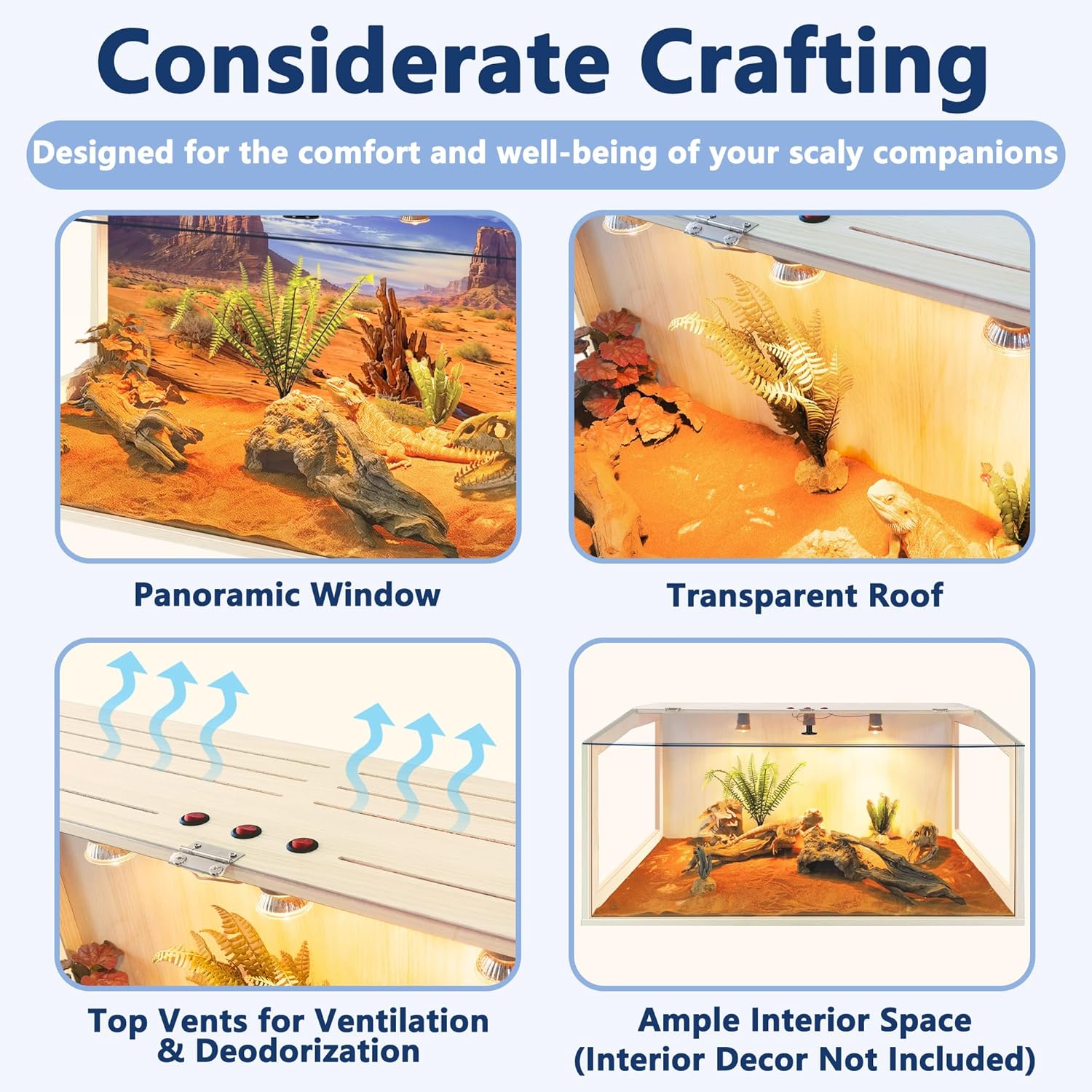 - 【Superb Reptile Habitat】Designed for reptile lovers, our enclosure offers spacious interiors for your reptiles to roam freely. The front acrylic panel guarantees crystal-clear visibility, while top and side vents ensure optimal airflow. Please note: This habitat is not suitable for water storage. Available in 4 sizes to suit your needs!