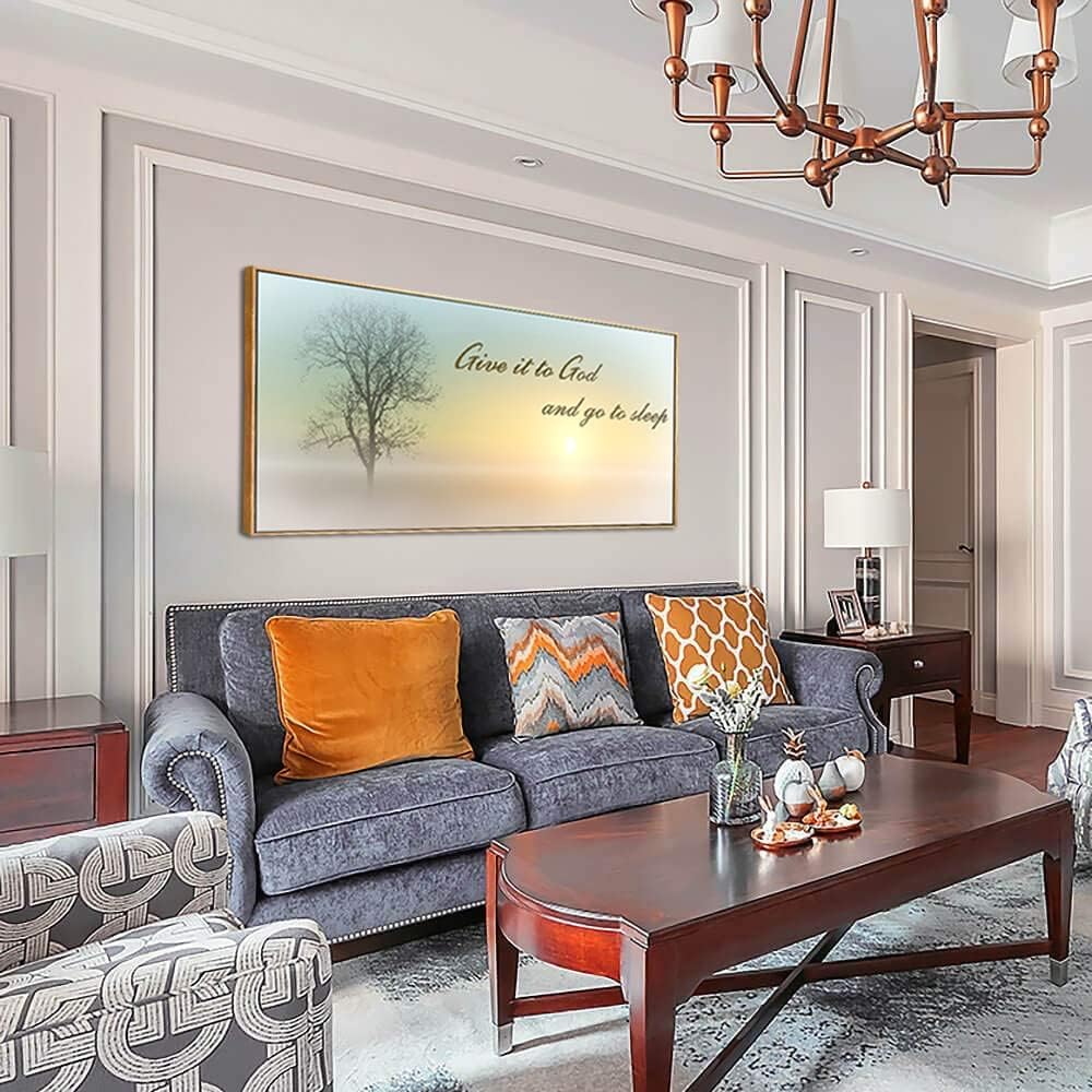 Lasdel Natural Extra Framed Canvas Wall Art of Misty Sunset & Tree Plant Picture For Bedroom Home Above Bed,White Country Wood Sign For Bathroom,Give It To God & Go to Sleep Artwork Decor,30x60
