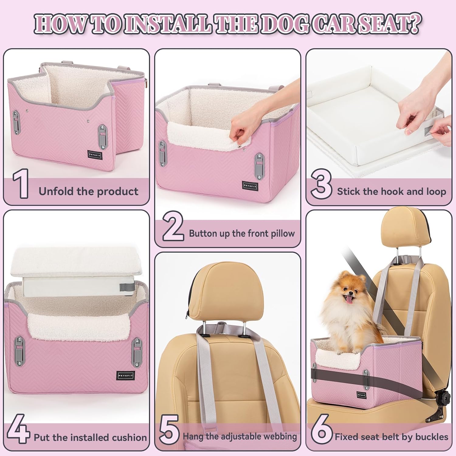 PETSFIT Dog Car Seats for Small Dogs, Portable Puppy Car Saet for Car with Clip-On Leash, Adjustable Straps Suitable for Small Pets Up to 25lbs (Light Pink)