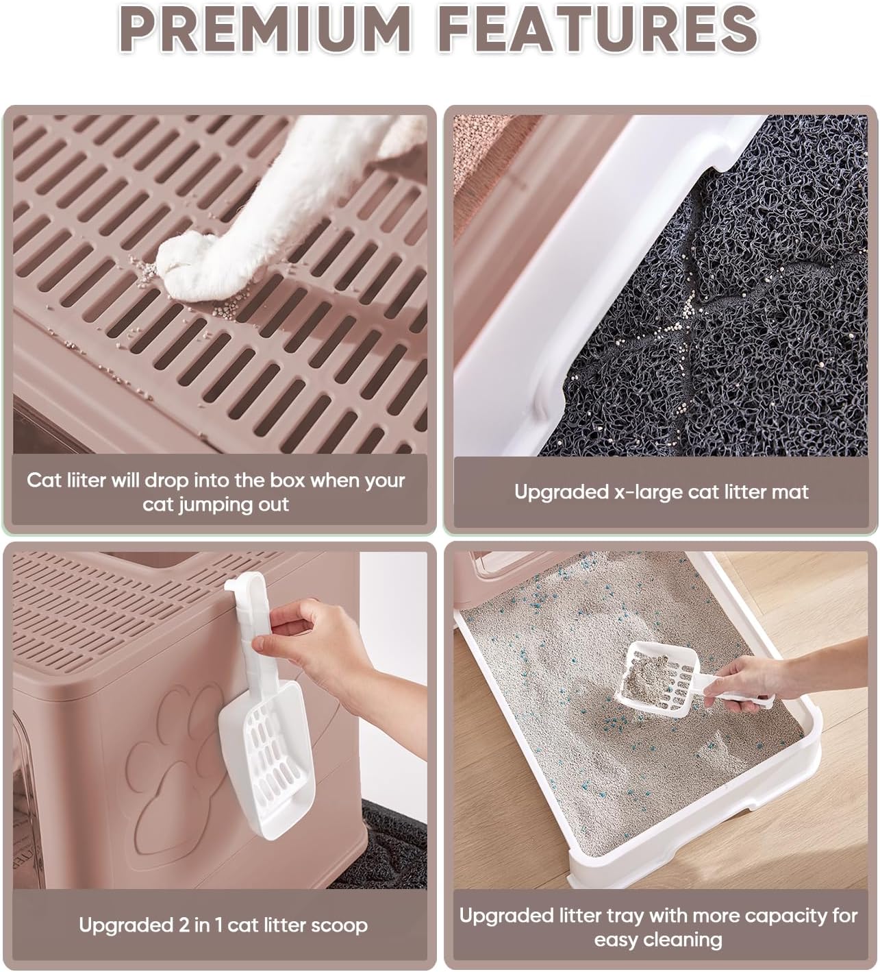 Cat Litter Box with X-Large Litter Mat and Scoop, Large Foldable Litter Box with Lid, Enclosed Kitty Box,Front Top Entry Exit, Odor Control Easy to Clean (Upgrade Coffee)