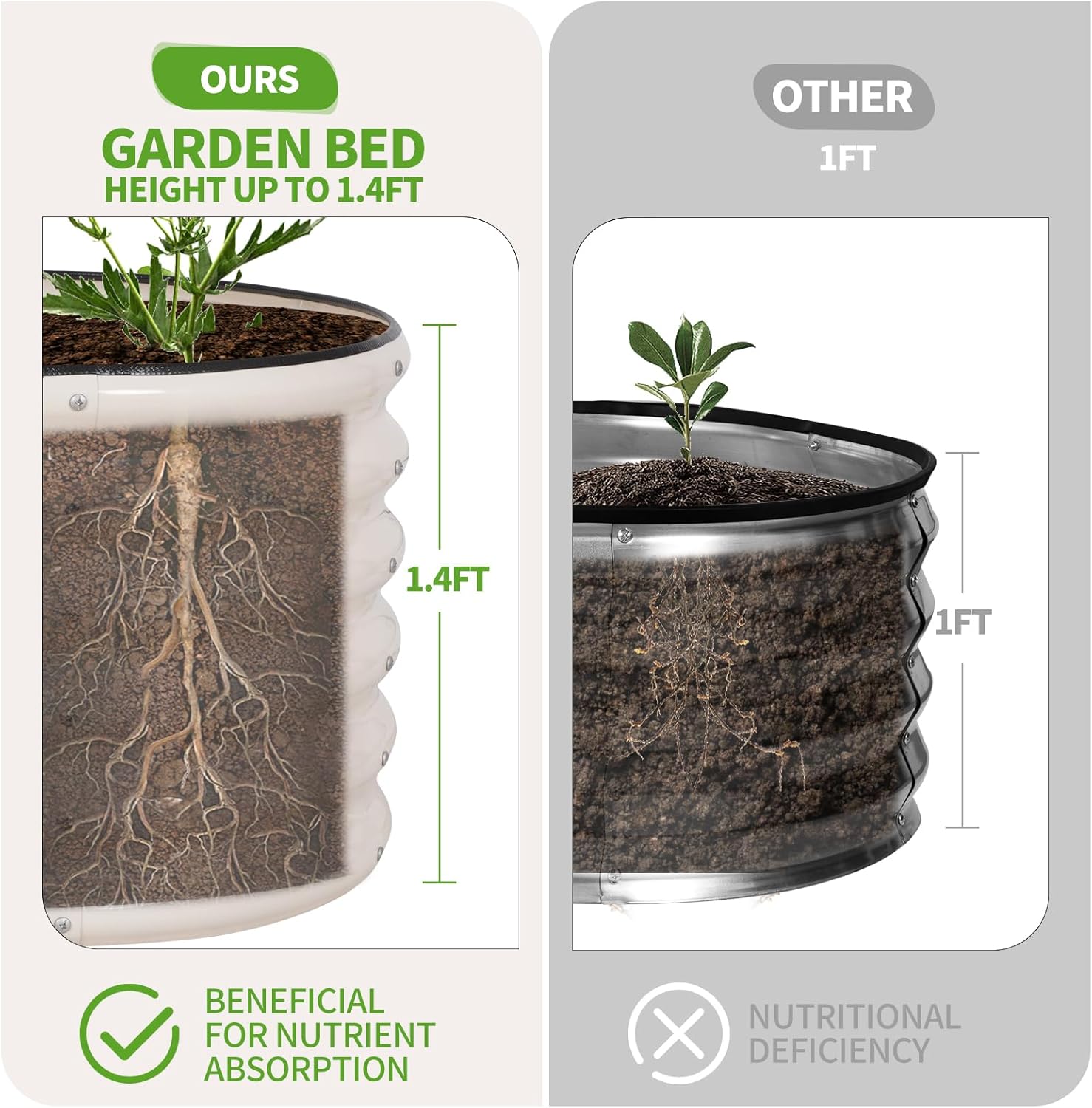 - 【Higher Height】The height of this planter garden bed is 1.4 ft, which is higher than other galvanized planter beds suitable for the growth of deep rooted plants. Higher heights are very knee friendly. When standing, you can easily pick vegetables with your arms.Make your planting life more relaxed and enjoyable