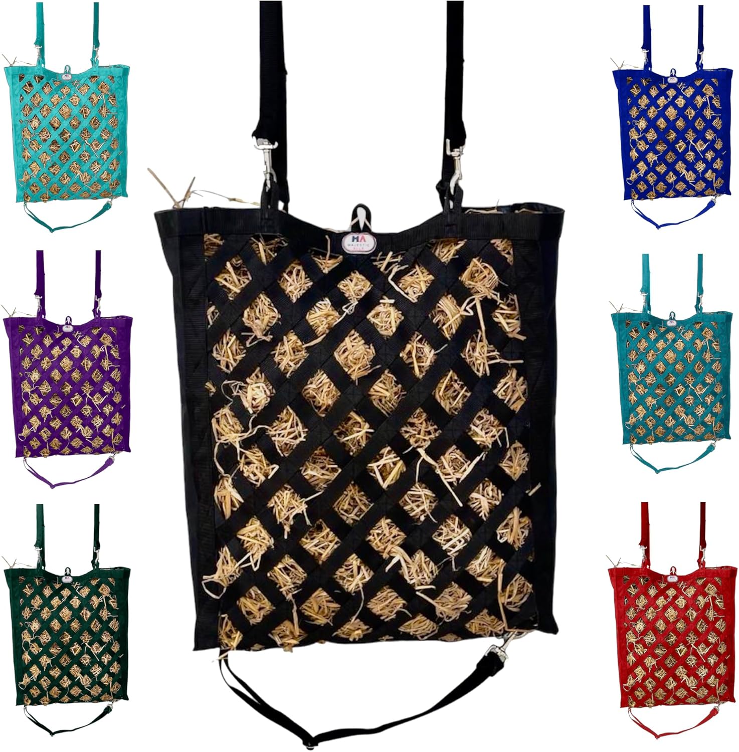 Majestic Ally Premium Nylon Hay Bag for Horses and Livestock, Simulates Grazing, Slow Feeding, Heavy-Duty PP Webbing,Quick-Adjust Straps, Small Hole for Digestion, Multiple Colors (Black)