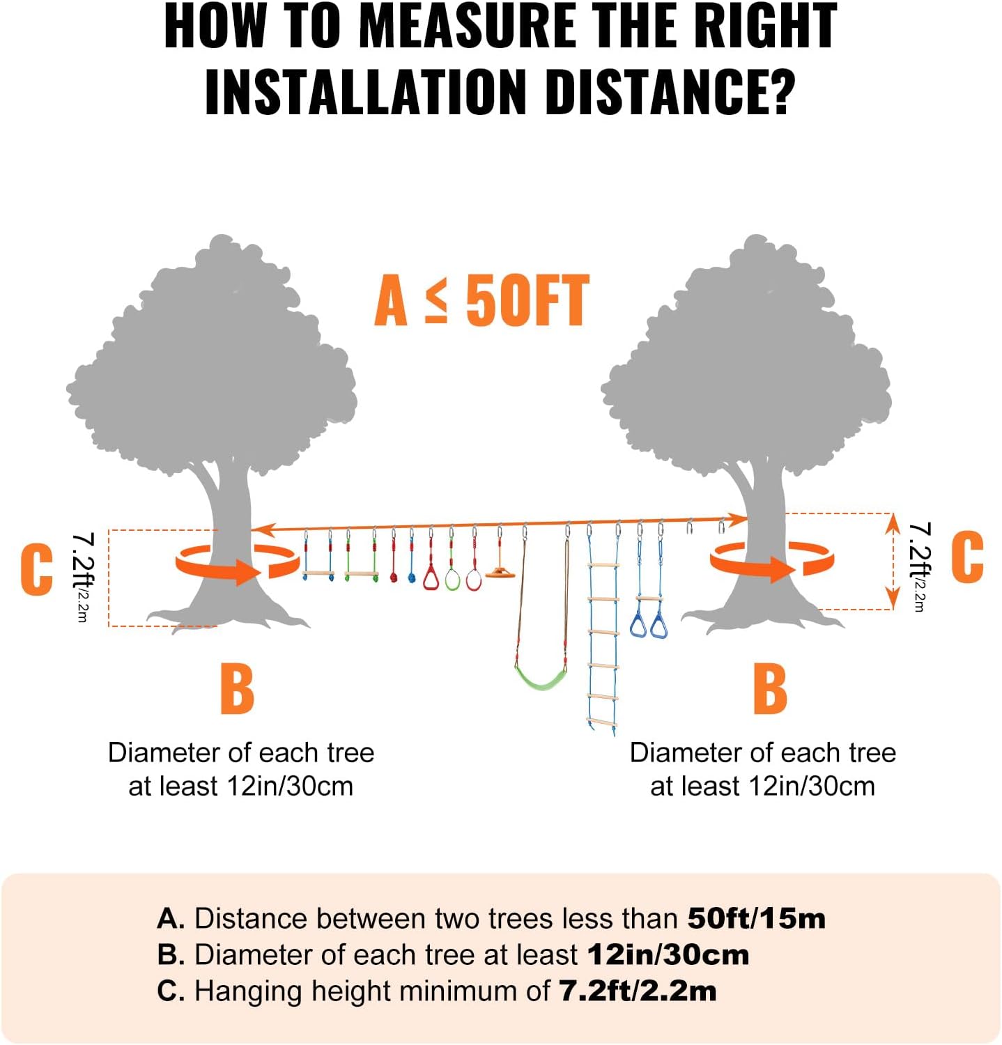 VEVOR Ninja Warrior Obstacle Course for Kids, 1 x 50 ft Weatherproof Slacklines, 500lbs Weight Capacity Monkey Line, Outdoor Playset Equipment, Backyard Toys Training Equipment Set with 10 Obstacles