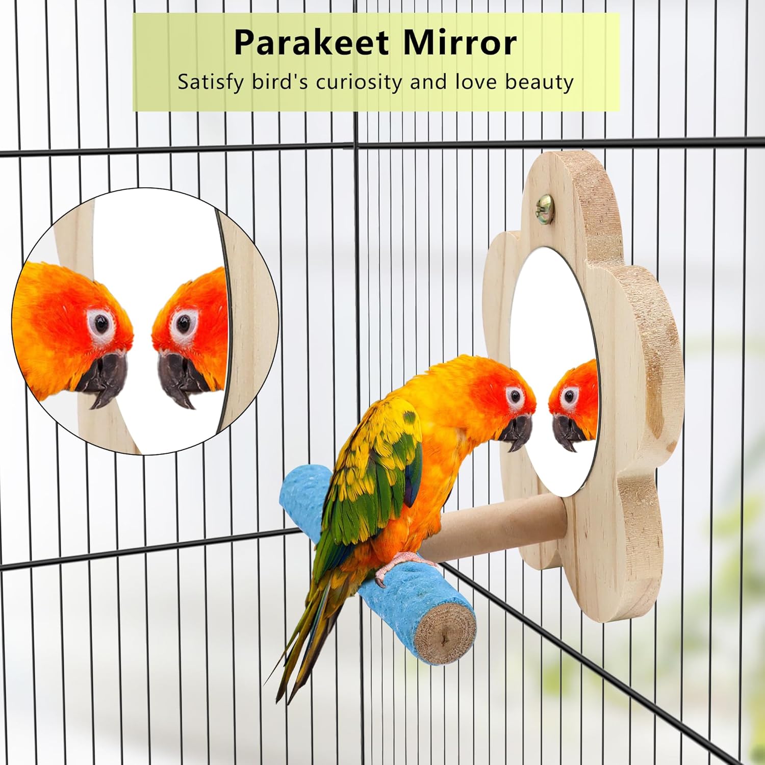 Small Bird Mirror Parrot Swing,Wooden Parakeet Perches Flower Interactive Play Toys for Small Budgies Macaw African Grey Parakeets Lovebird Cockatiel Cage Accessories (S, Wood-1p)