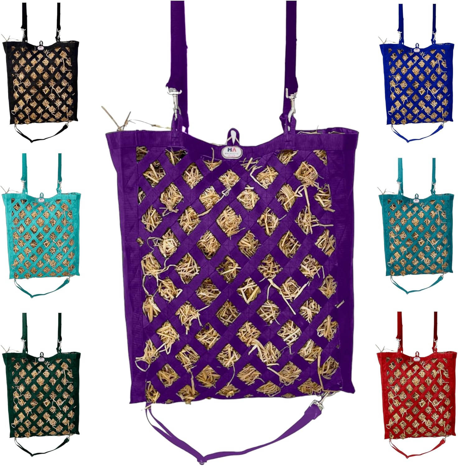 Majestic Ally Premium Nylon Hay Bag for Horses and Livestock, Simulates Grazing, Slow Feeding, Heavy-Duty PP Webbing,Quick-Adjust Straps, Small Hole for Digestion, Multiple Colors (Purple)