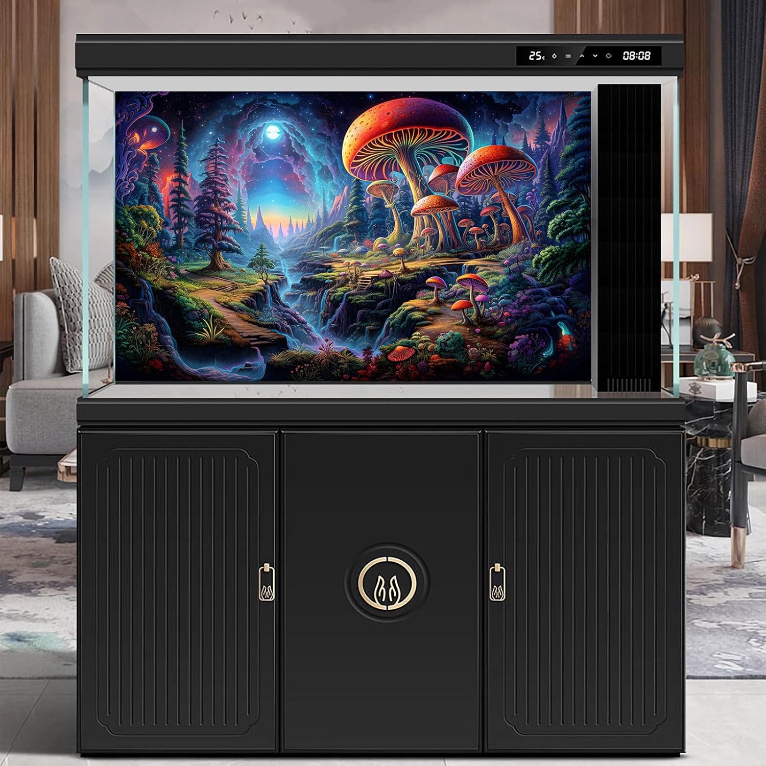 Forest Aquarium Background Fantastic Cartoon Forest Landscape with Mushrooms and Flowers Terrarium Background Fantasy Pine Tree Mysterious Mushroom Theme Fish Tank Backdrop Poster Decor 48x18in