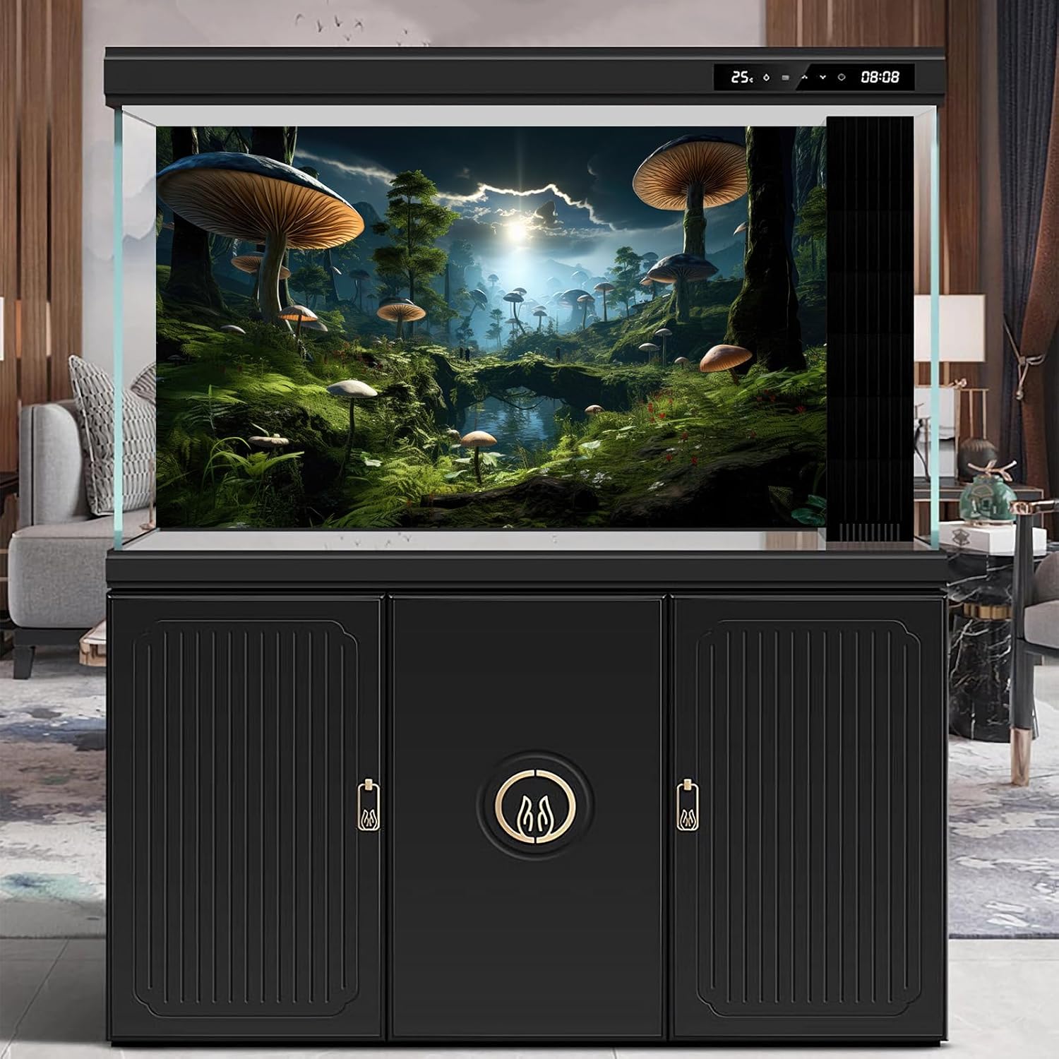 Fantasy Mushrooms Landscape Aquarium Background Tranquil Stream Cloudy Sky Terrarium Background Lush Green Tropical Plants Trees Fish Tank Backdrop Decoration Tank Background Poster 24x12in