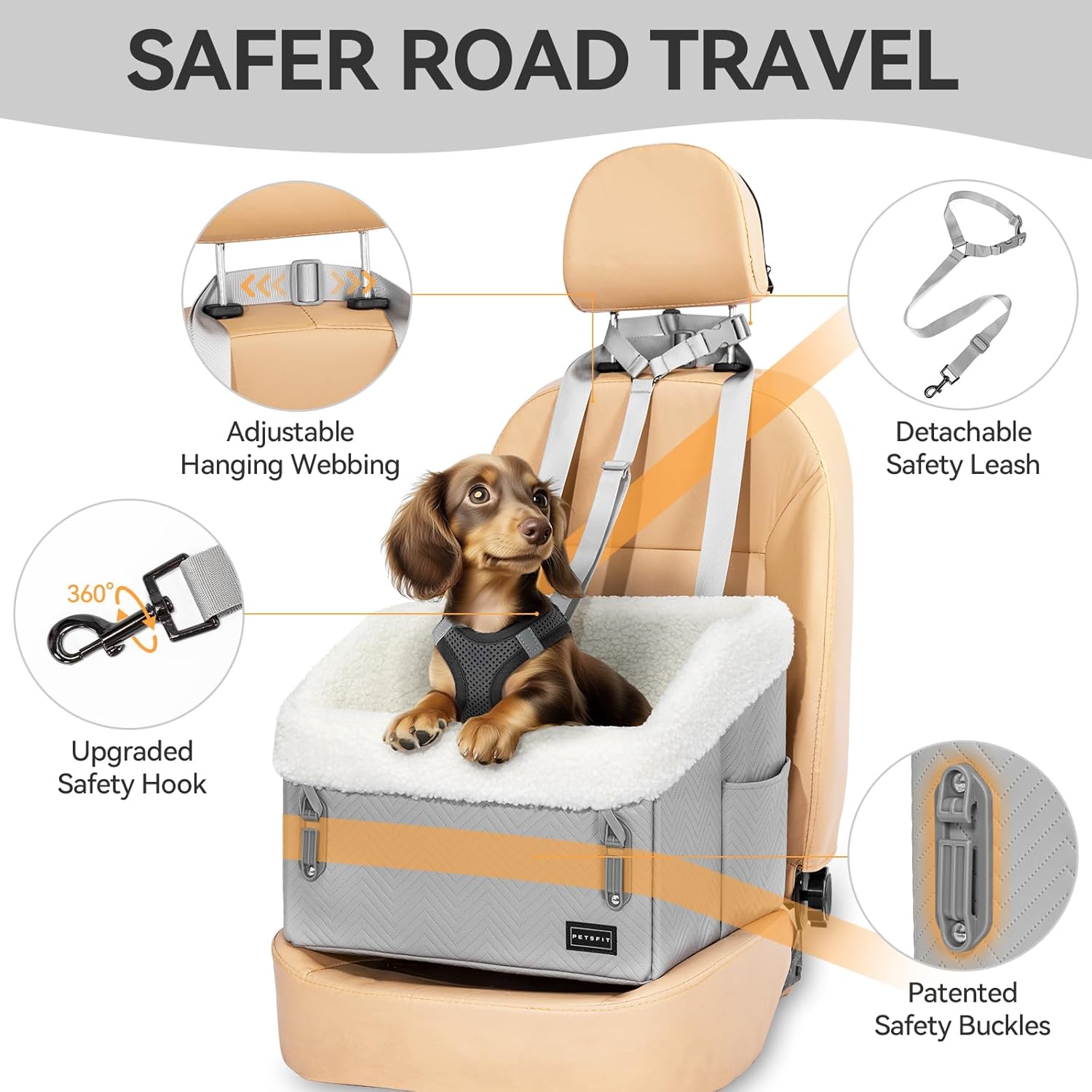 PETSFIT Small Dog Car Seat, Waterproof PU Leather Dog Booster Car Seat with Patented Safe Buckles, Pet Carseat for Medium or Small Sized Pets up to 30 lbs (Grey)