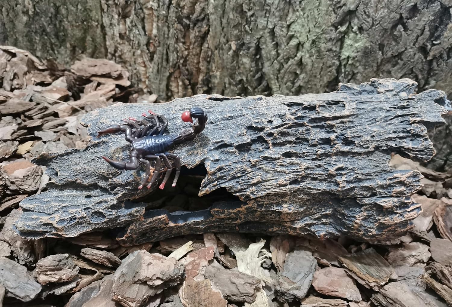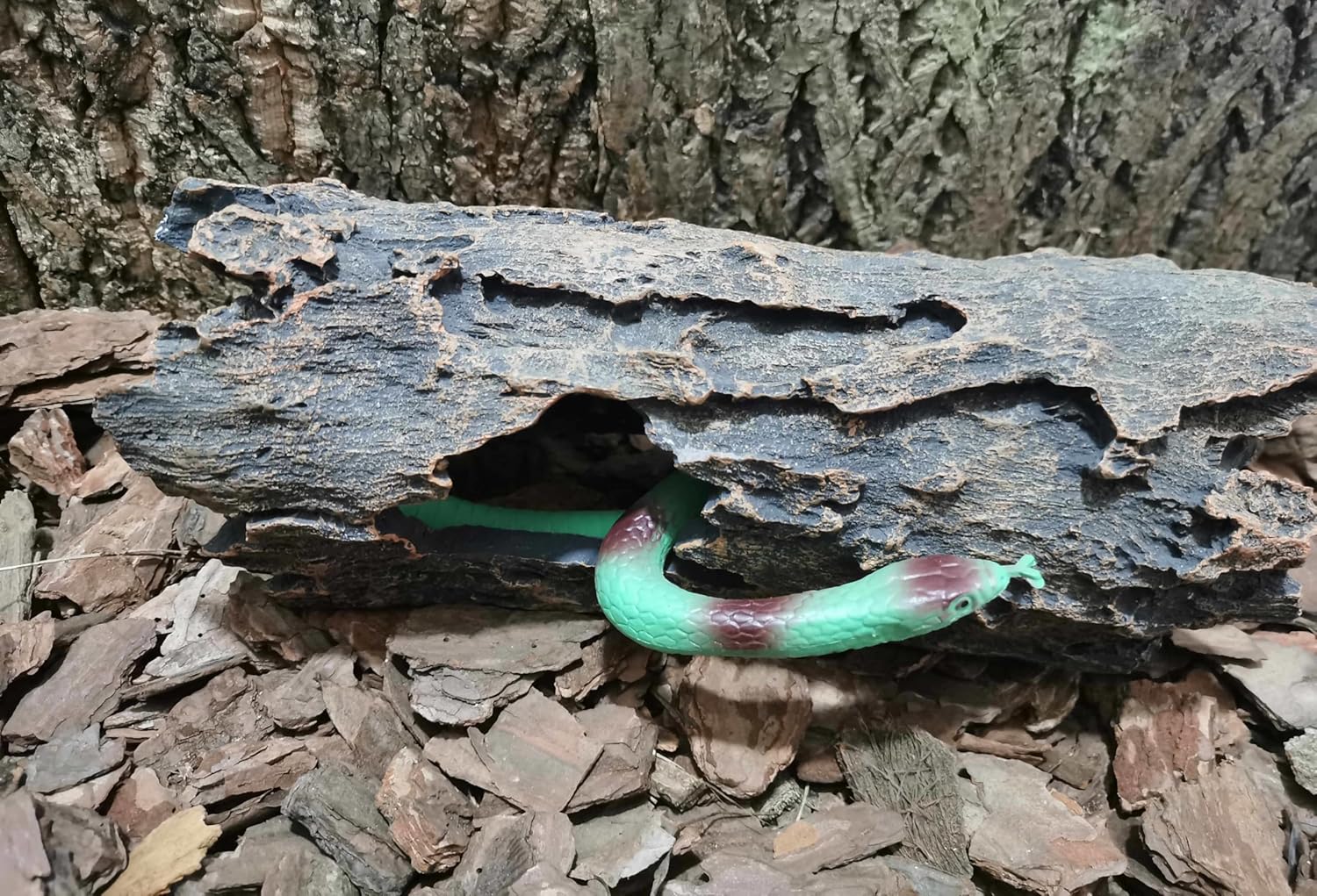• 1.The design inspiration comes from nature. Simulated resin bark texture reptile hides is your first choice for reptile tank accessories.The natural colors and realistic bark textures create an original ecological living environment for reptiles.Young ball pythons , corn snakes and hamsters can hide in it or move through it.It's a bit small for an adult ball python. It can also be used as fish tank accessories,allowing your little fish and shrimp to happily hide and swim around.