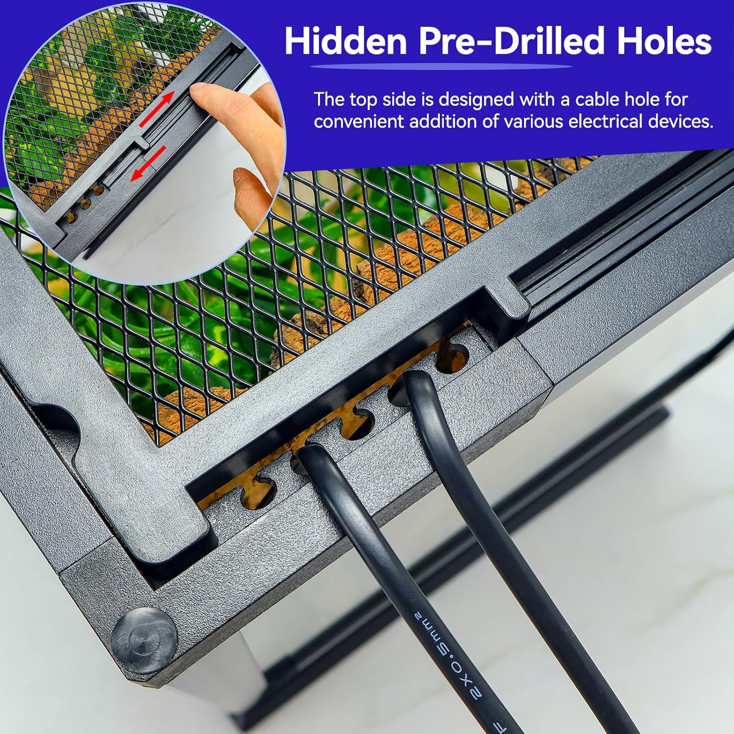 - 【Hidden Pre-Drilled Holes】: The terrarium's top is equipped with pre-drilled holes, perfect for setting up lighting, misting systems, and other reptile tank accessories. Whether you're creating a chameleon cage, a large terrarium, or a vivarium tank, this feature adds practicality without compromising aesthetics.