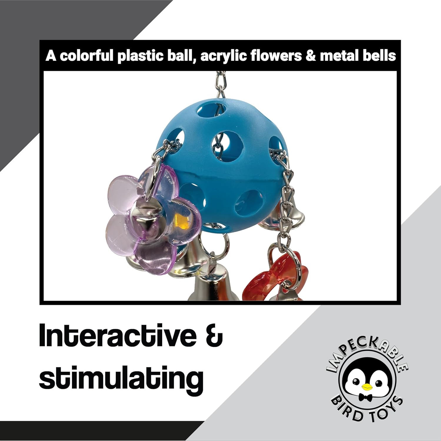- - 1937 Flower Ringer Bird Toy features colorful acrylic flowers, bells and chain legs for a bright and engaging cage play experience