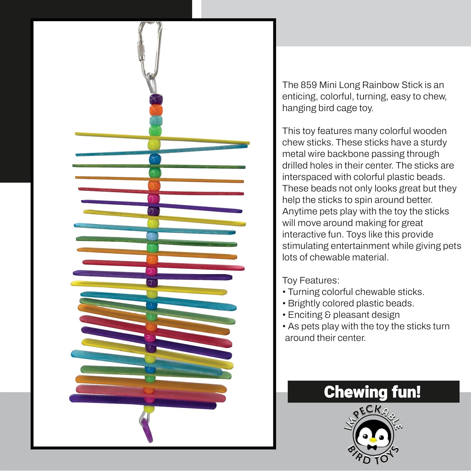 - Built with layered rainbow-colored wooden sticks separated by vibrant beads strung on a sturdy metal wire. When pets play with the toy the sticks will turn around their center for moving fun!