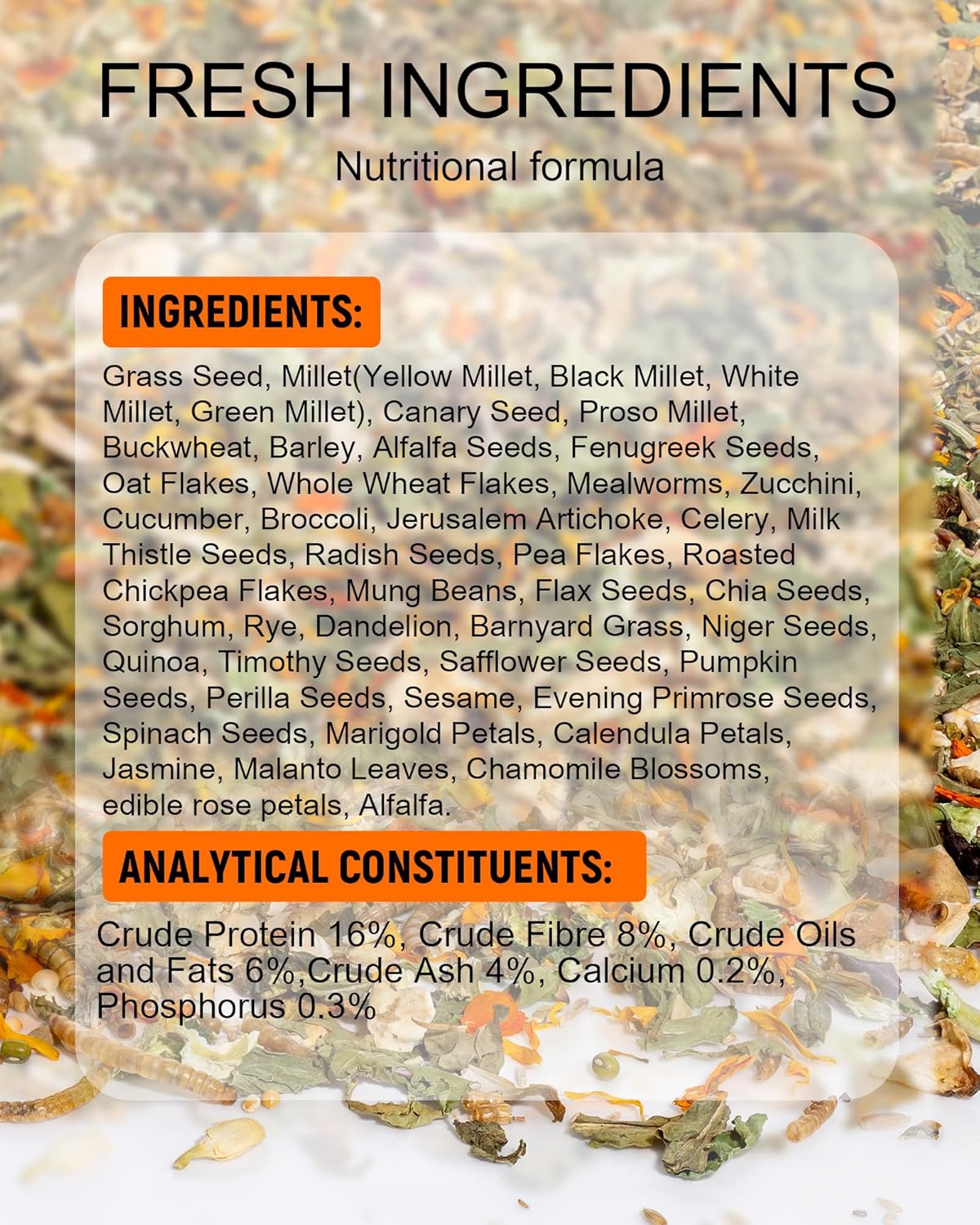 - Wholesome Ingredients for Balanced Carefully: Niteangel blend includes carefully selected seeds such as millet, buckwheat, and alfalfa, paired with nutritious vegetables like zucchini, cucumber, and broccoli. Protein-rich mealworms and pea flakes complete the mix, offering a well-rounded variety of flavors and nutrients tailored to meet your pet’s needs.