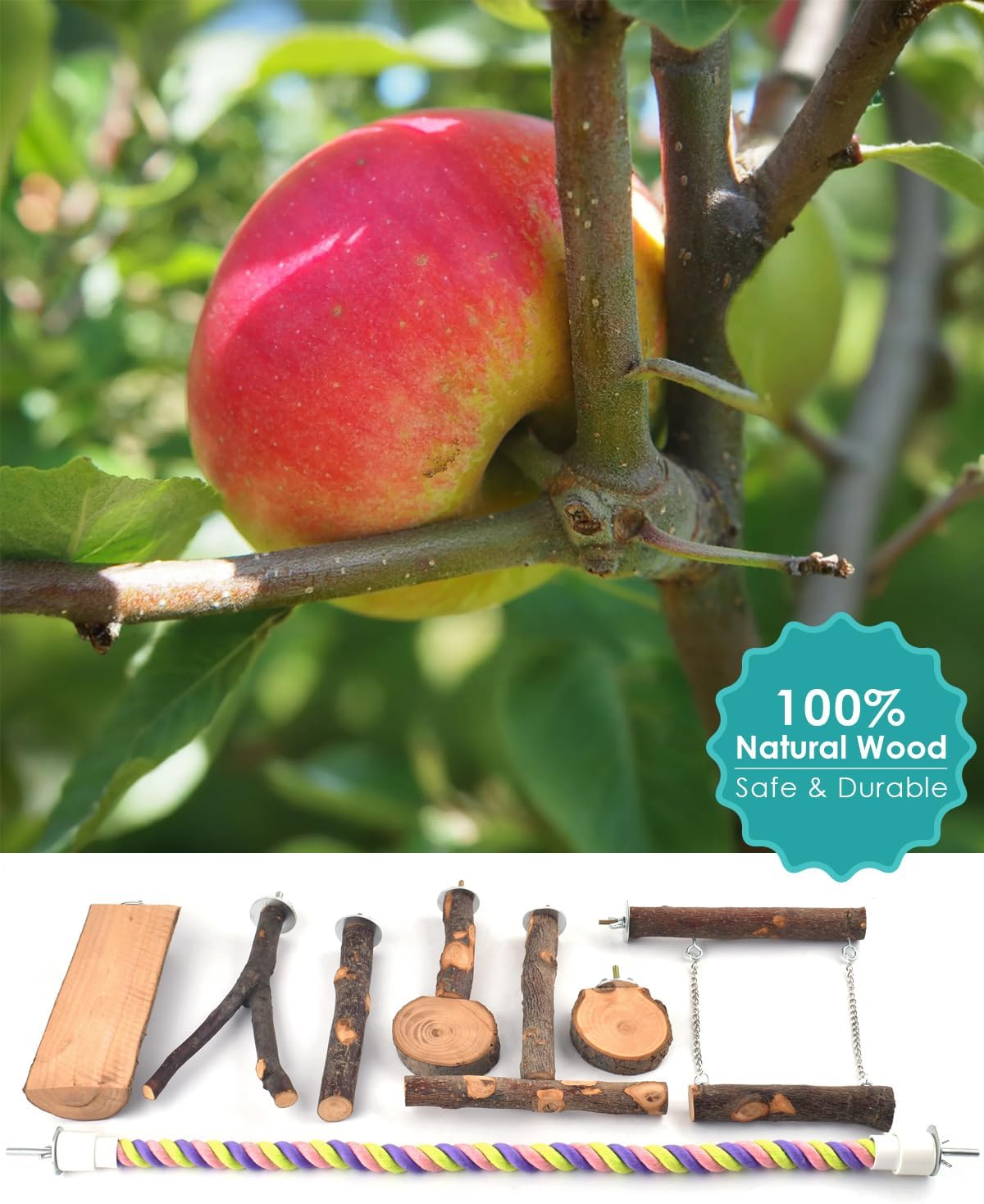- Bird Cage Accessories: bird wooden perches set includes 1 Bird Swing, 1 Combo T-Shaped Perch, 1 Combo Oblong Round Platform, 1 Y-Shaped Perch, 1 Square Platform, 1 Round Platform, 1 Wooden Perch and 1 Bird Rope. Note: Due to the fact that the perches are made of natural apple wood, individual shapes may vary