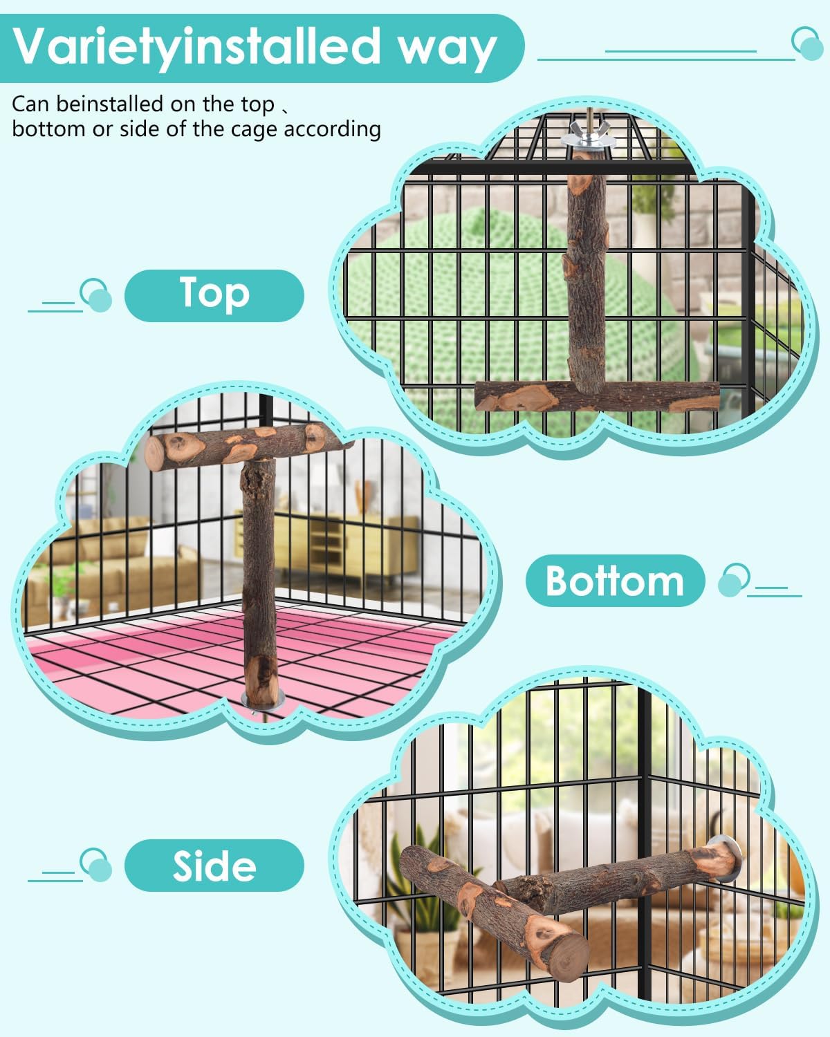 - Perfect Design: Each perch platform for parrots is equipped with a metal wing nut and built-in bolts, enabling it to be firmly attached either inside or outside the cage without the requirement of additional installation equipment. This provides the parrots with extra living and landing space, creating a natural habitat