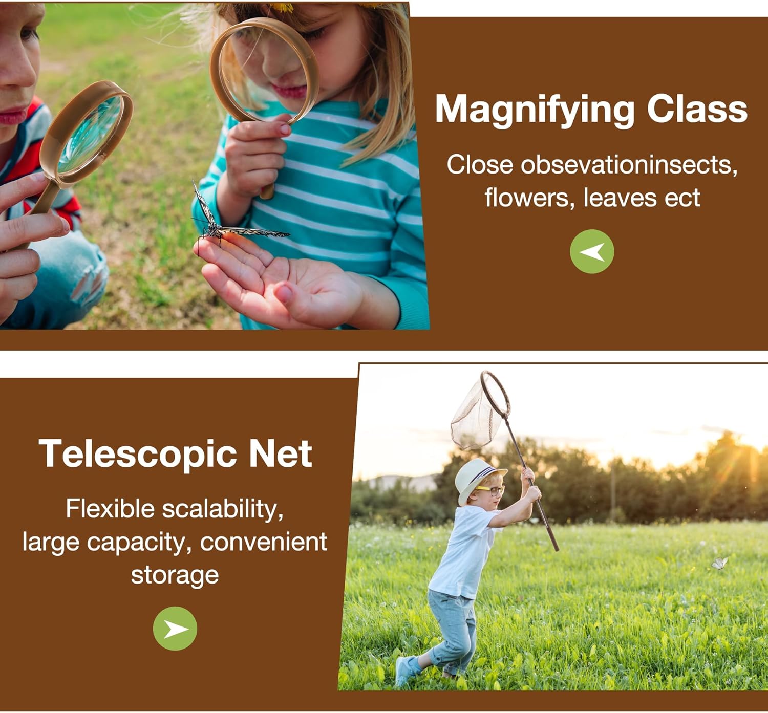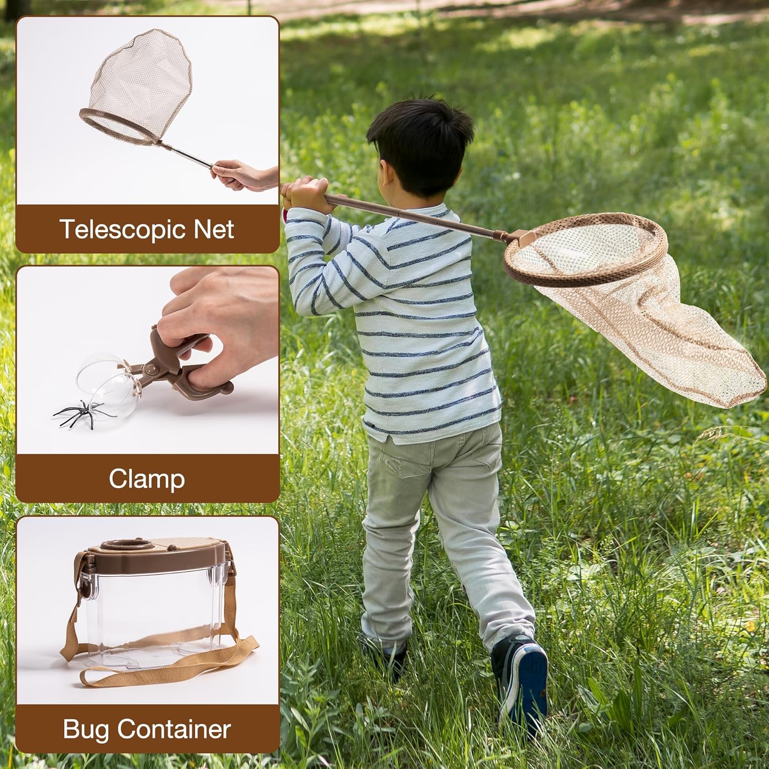 - 【All-in-One Adventure Kit】 This comprehensive set includes a magnifying glass for close-up observations, an extendable net, tweezers, a grabber, a cage, a container, cards, and a portable bag. It has everything kids need to dive into exciting outdoor adventures.