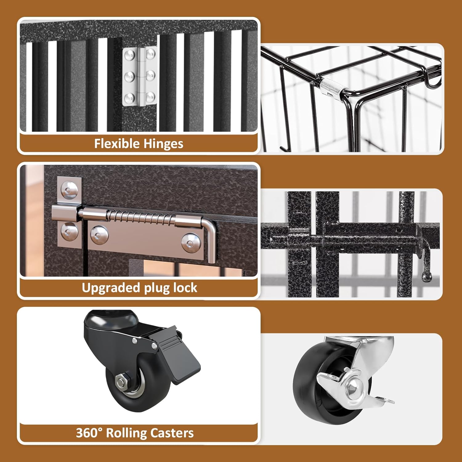 - Superior Mobility and Security: Featuring four 360-degree swivel casters, this extra-large dog kennel delivers exceptional maneuverability throughout your home. Each caster includes a locking mechanism to securely anchor the crate in place. The double upgrade bolt locks enhance security, offering peace of mind for pet owners with anxious dogs. The dual-door design ensures easy access for your pet while promoting convenient interaction and feeding.