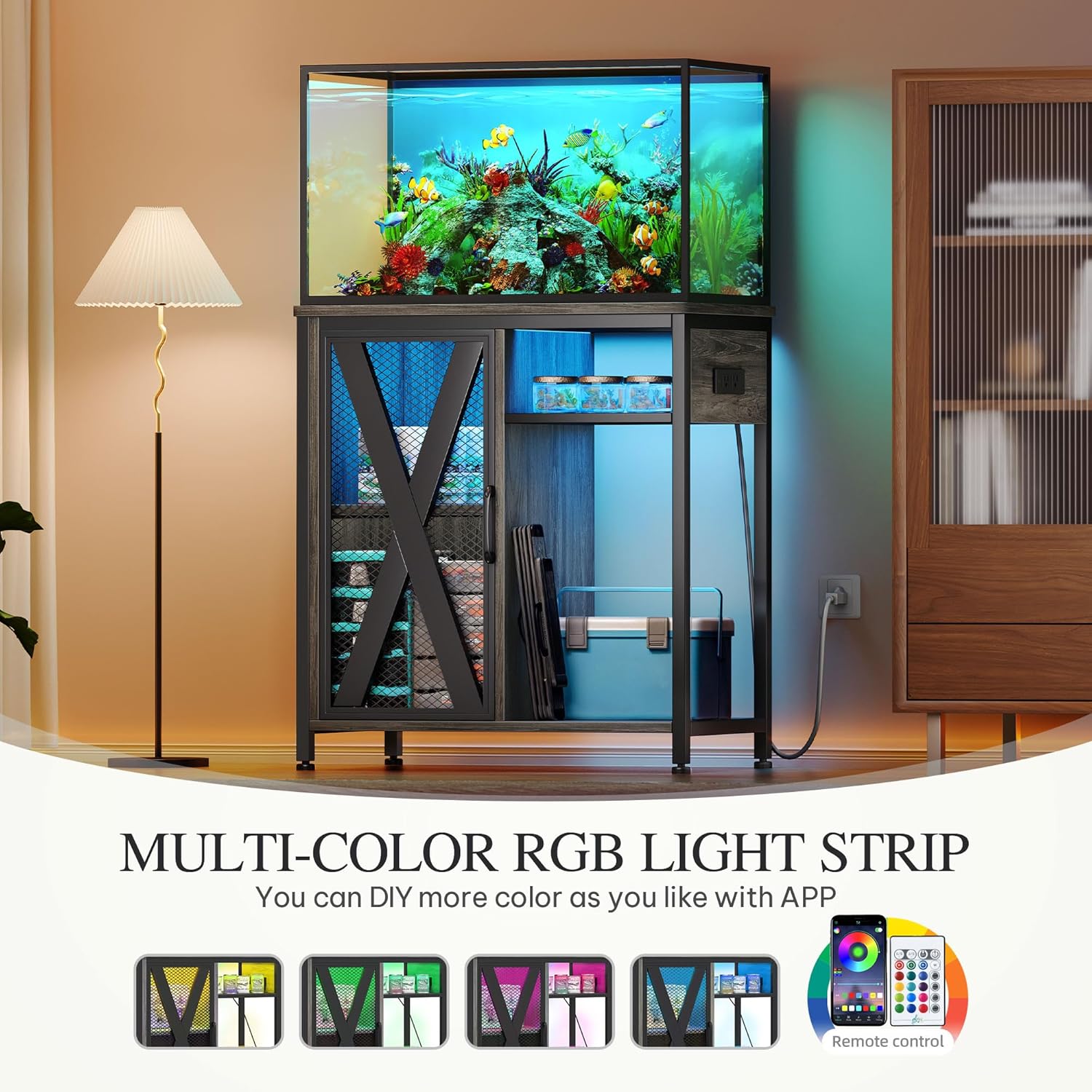 - Smart LED Lights: Enhance Your Aquatic Oasis with Our Captivating Aquarium Stand. Featuring Mesmerizing LED Lighting with RGB Customization, immerse yourself in a tranquil ambiance that can be tailored to suit any mood or occasion. Keep water away from outlets & led lights when turned on to prevent damage