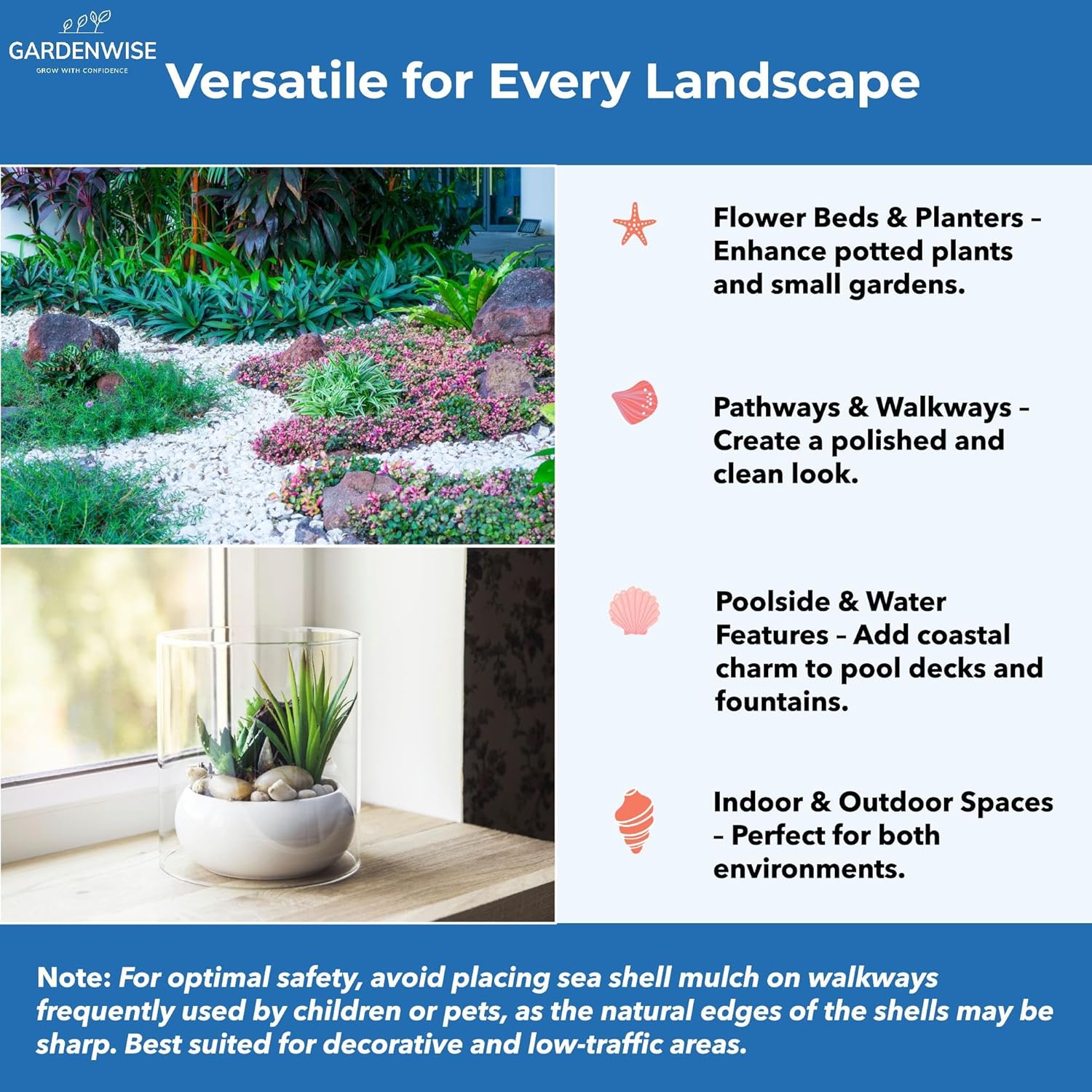 - Pest-Resistant and Safe: Sea shell mulch does not attract ants, termites, or other pests, providing a long-lasting, clean solution for landscaping without the use of chemicals.