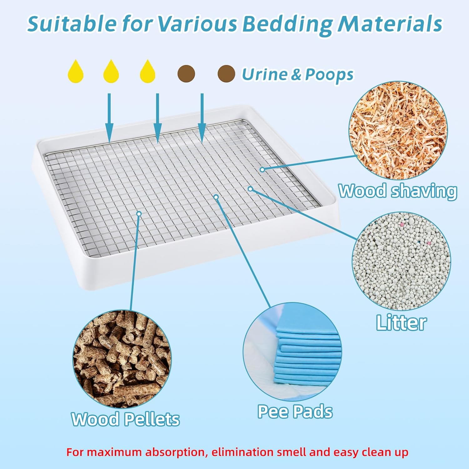 - How to stay cleaner: Small animal litter pan is deep enough to have a layer of wood pellets for bedding; Use a pee pad & bedding under the mesh for maximum absorption and easy clean up; Put some non-scented all natural kitty litter in the tray as well so their pee will clump there; Also put some carbonated litter powder inside that definitely helps with the smell