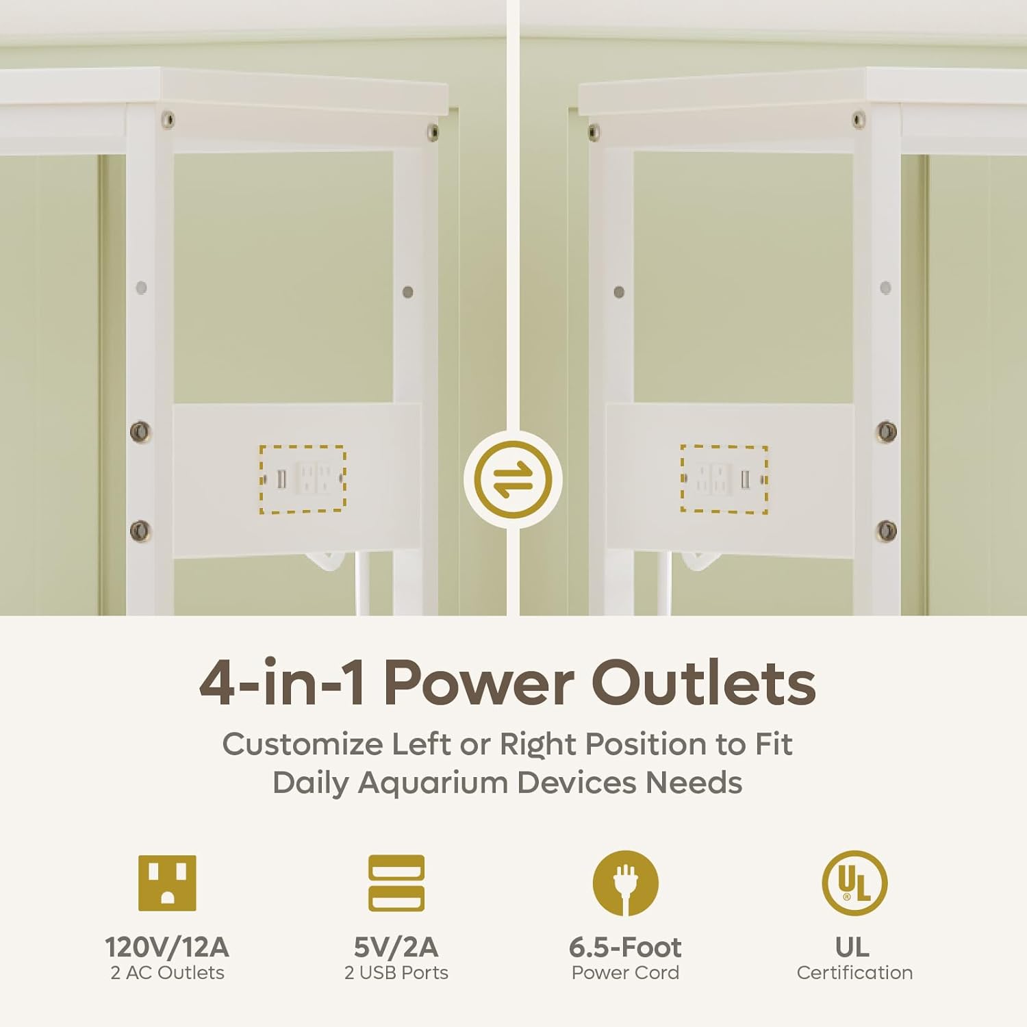 - 4-in-1 Power Outlets: The 29 gallon fish tank stand includes 2 AC and 2 USB outlets, installable on either side for flexible cable management, ideal for powering filters, lights, heaters, and charging devices