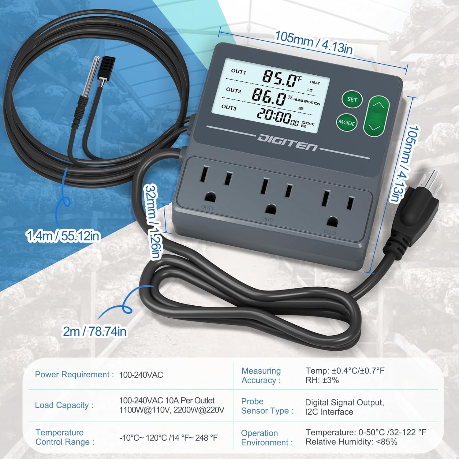 DIGITEN Temperature and Humidity Controller with Timer - 3 Outlet, 2 Separate Probes, Plug in Temperature Controller for Reptiles,Snake, Mushrooms, Tent, Triple Control for Temp,Humidity,Time