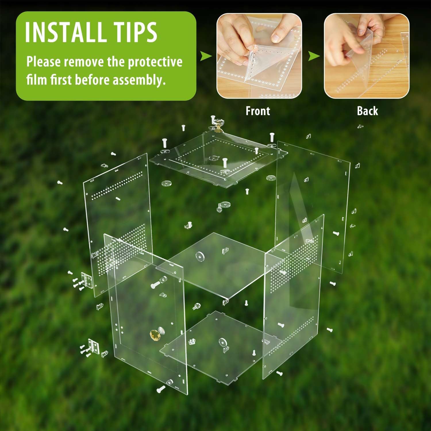 - 【 DIY Installation & Pro Tip 】 Assemble the spider terrarium is hassle-free in minutes. Peel off the protective films on both sides before setup. For dual spiders, change the orientation of the side panels during assembly to maximize air circulation