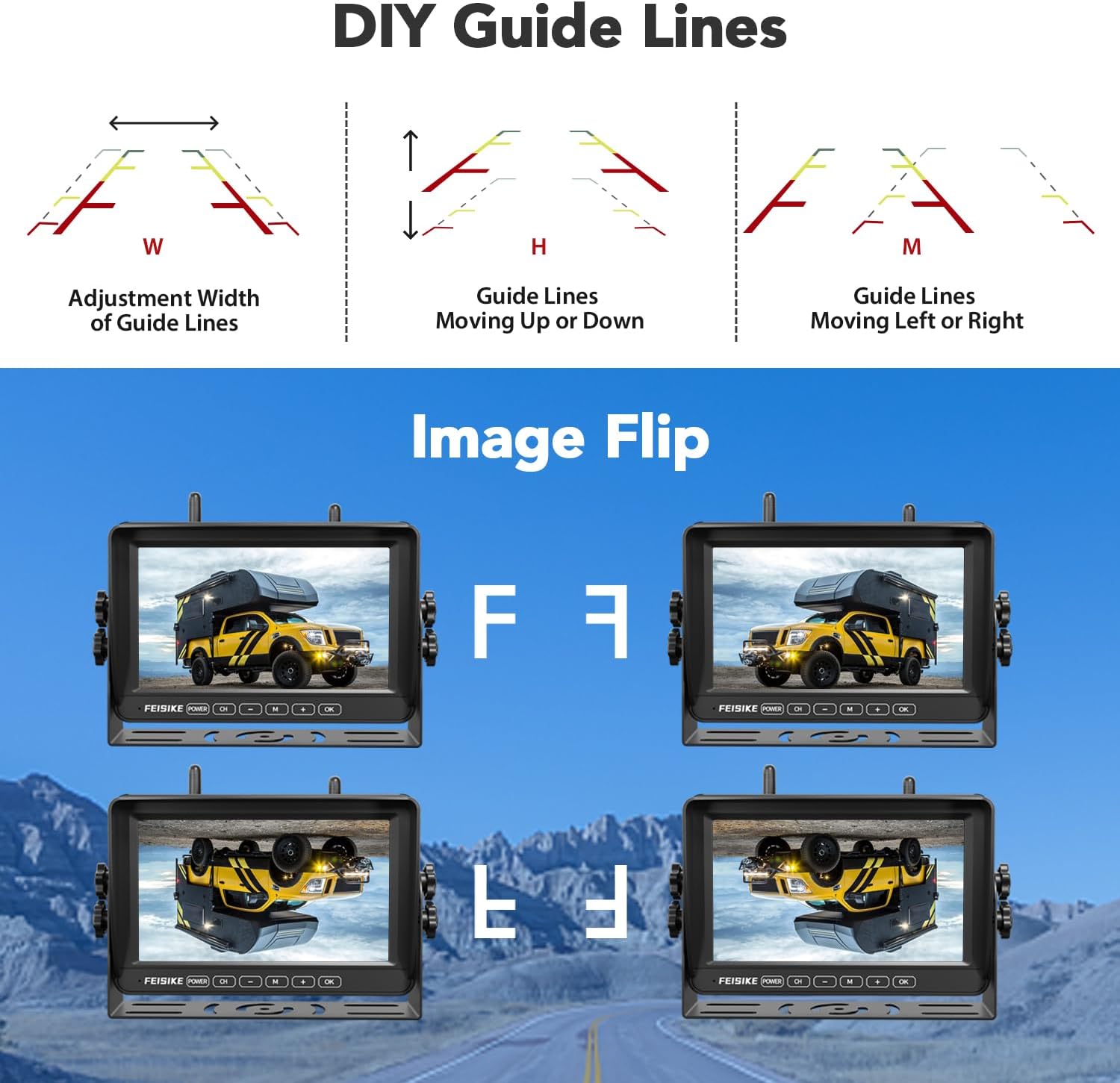 - 【1080P HD Monitor & IR Night Vision】The 7-inch monitor displays in true 1080P HD, delivering vivid, real-color images. Equipped with infrared LED lights for excellent night vision, this camper backup camera wireless ensures visibility and safety around the clock—even in low light or complete darkness.