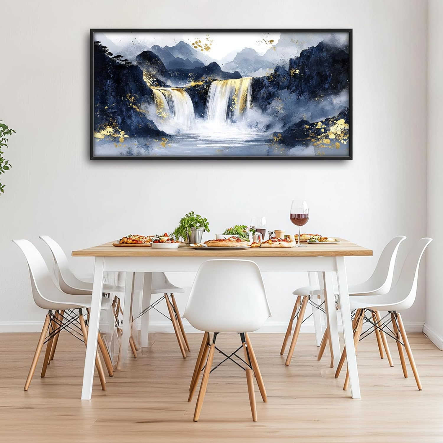 - 【Unique Design】 Waterfall, with gold foil embellishment, a blue and gray color scheme, and mountains in the distance. The waterfall flows down from the top left to the bottom right of the picture, with an ink splashing effect. The upper half of the canvas features white space, with additional ink splash effects.
