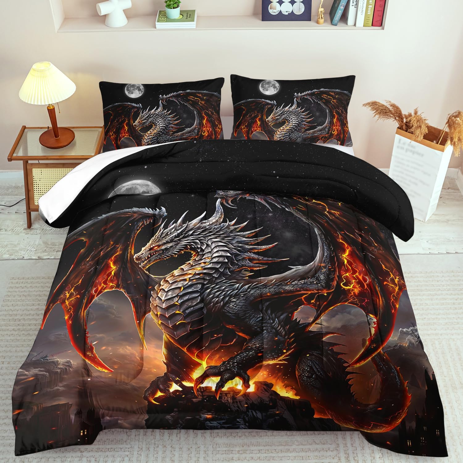 - Twin Size Flame Dragon Comforter Set :This bedding set includes 1 comforter(67" x 85") and 2 pillowcases(20”x30”). In order to facilitate transportation, the quilt is made of vacuum compression technology. It will be slightly wrinkled when taken apart, but it will quickly regain its fluffiness if you gently beat it.