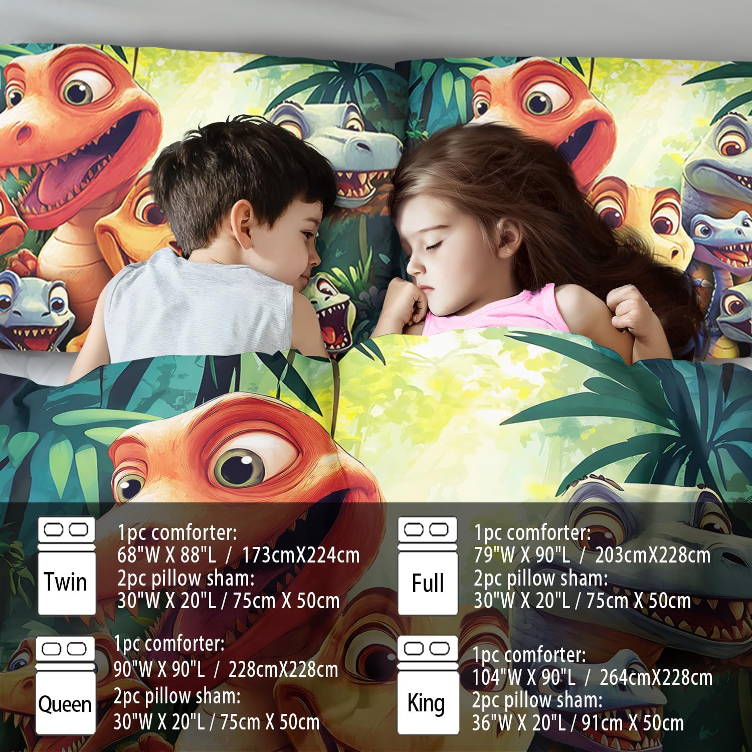 - Twin Size Dinosaur Comforter Set :This bedding set includes 1 comforter(67" x 85") and 2 pillowcases(20”x30”). In order to facilitate transportation, the quilt is made of vacuum compression technology. It will be slightly wrinkled when taken apart, but it will quickly regain its fluffiness if you gently beat it.